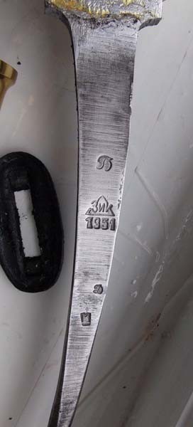 11.И соответственно на хвостовике ( стебле ): более ранние — клеймо браковщиков «Г» годен и клеймо «Р», позже клеймо «ЗиК» с указанием года выпуска четырьмя цифрами , начальная буква фамилии начальника технического контроля цеха , клейма военной приемки и номер плавки стали , из которой готовились клинки.