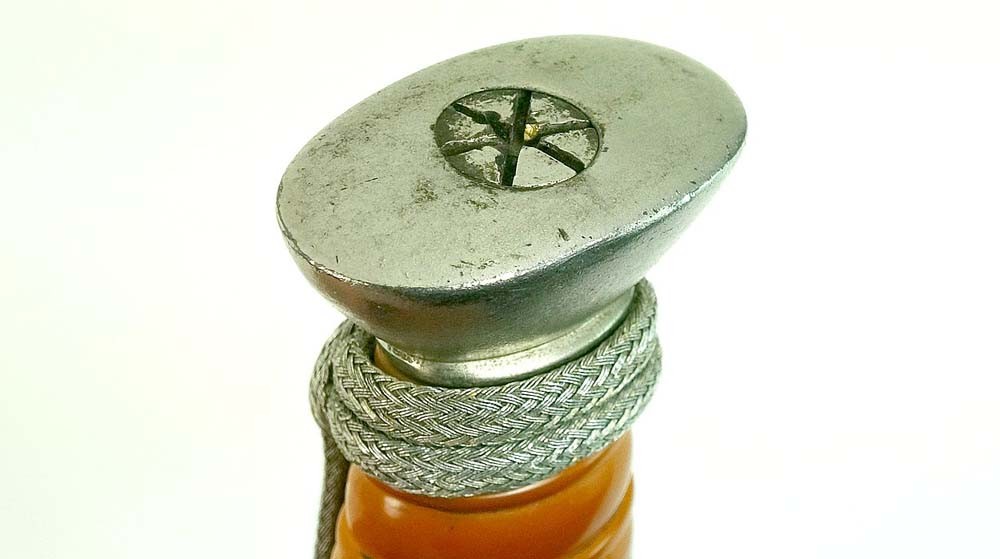 Головка рукояти и перекрестие похожи по стилю на тесак, и оба были никелированы. Основа рукояти была из металла качественнее, чем на тесаке. Все детали эфеса никелированные.