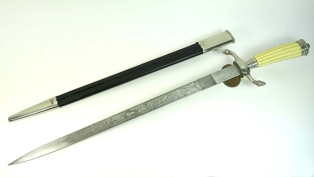 Клинок был длинною 37 см с вытравленными с обеих сторон стрелковыми мотивами. Общая длина была 54 см. Металлические ножны штыкового типа были обтянуты черной кожей. Существуют также образцы, которые немного длиннее.