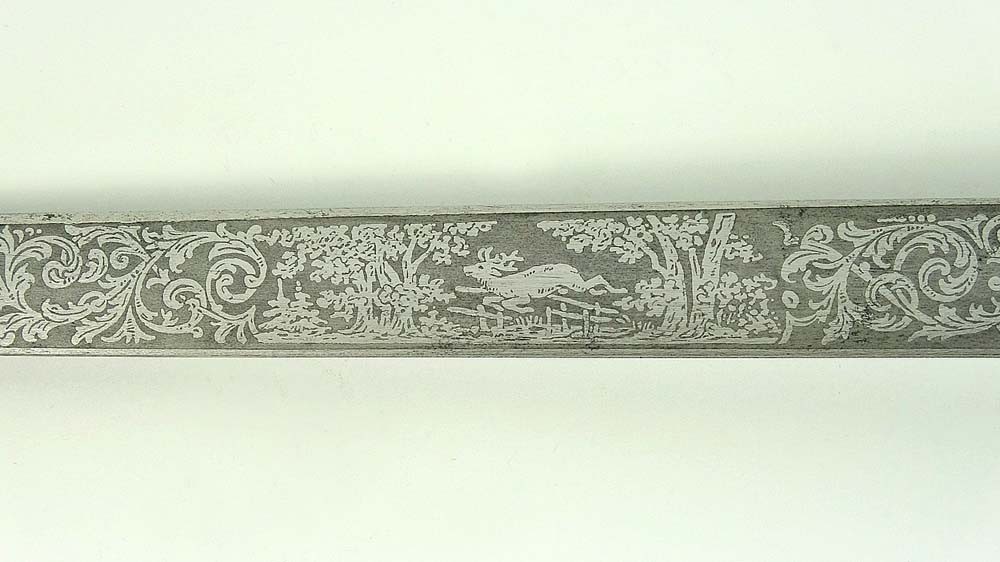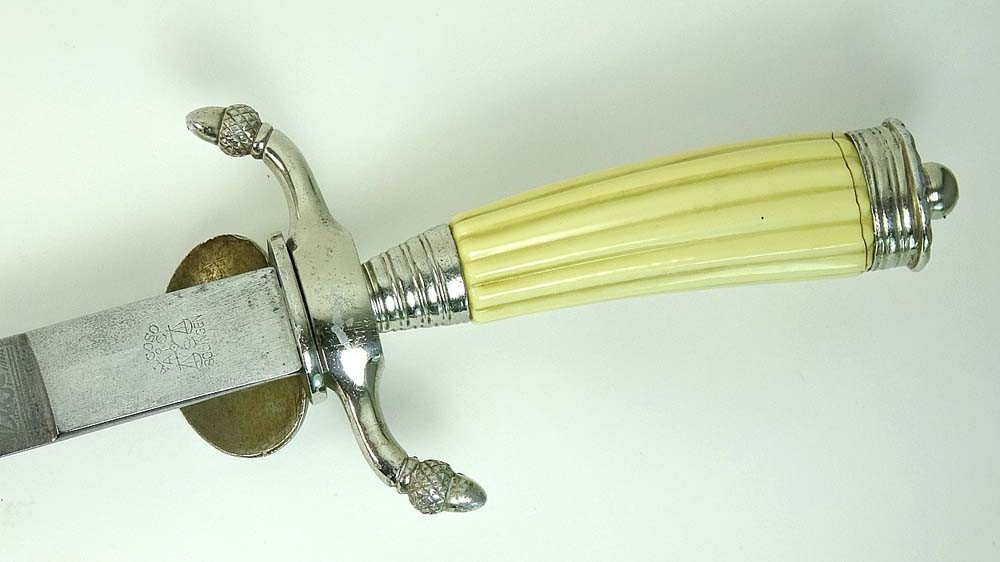 Рельефная рукоять была сделана из дерева и покрыта белым пластиком. На рукояти в центре с лицевой стороны были скрещенные две винтовки из алюминия, покрытые золотом. На крестовине на щитке была установлена серебряная эмблема Deutscher Schützen-Verband в средине с орлом, мишенью и двумя свастиками. Концы крестовины были декорированы в виде желудей.