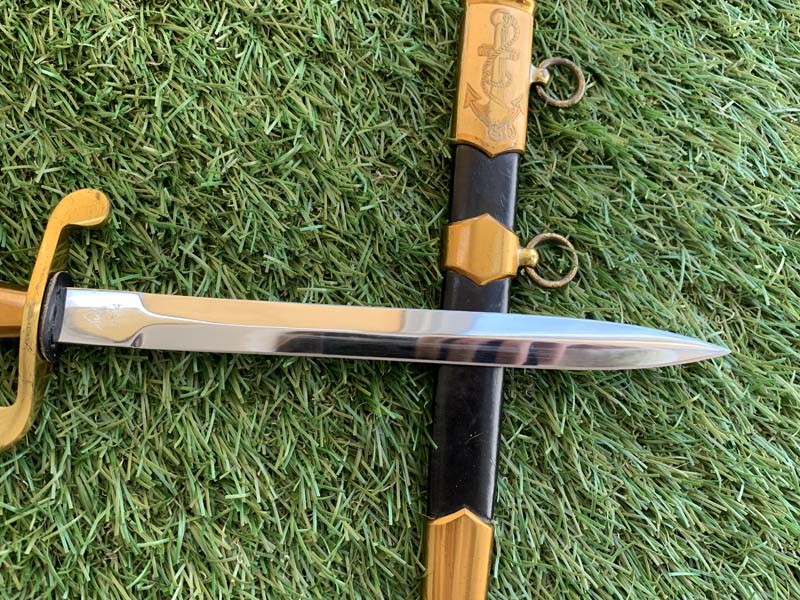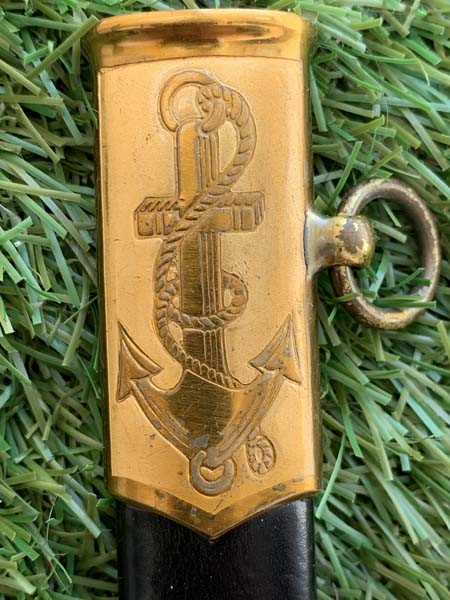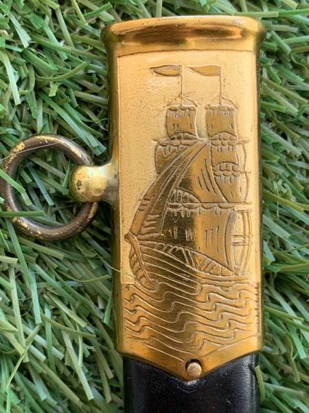 Ножны деревянные, обтянуты черной кожей. Все металлические части ножен и эфеса покрыты позолотой. Художественное оформление устья ножен состоит из изображения парусника па внешней стороне и якоря, перевитого канатом, на внутренней стороне. Рисунок наносился на поверхность устья ножен посредством травления.
