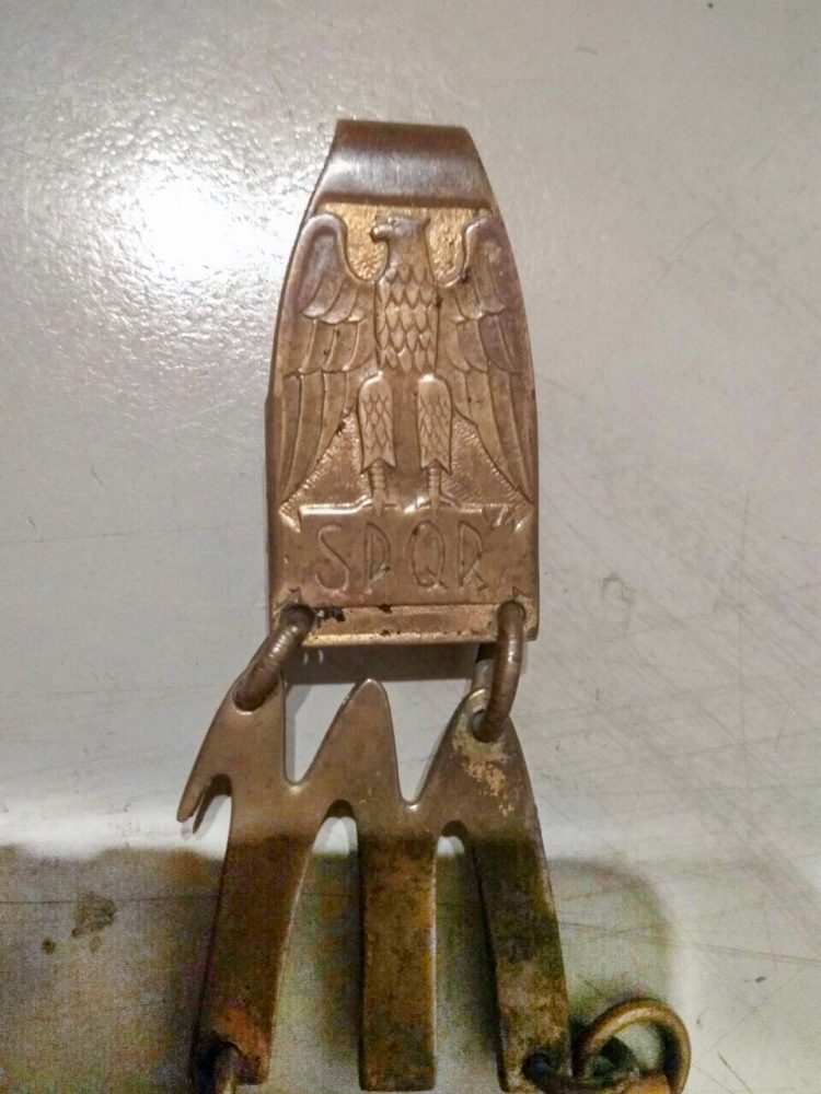 НОЖНЫ стальные, крашенные черной эмалью. Прибор ножен латунный, состоит из тонкого устья, двух тонких гаек с подвижными кольцами для портупеи и наконечника с шариком. ПОРТУПЕЯ состоит из двух латунных цепочек разной длины из 4 и 7 колечек с карабинами с одного конца для крепления к кольцам ножен. Другим концом цепочки крепятся к латунной букве «М», а та, в свою очередь, через колечки крепится к плоскому карабину, украшенному рельефным орлом и надписью «SPQR» — «Senatis Populus Que Romanes— «Сенат народа Рима». Карабин крепился к специальному кольцу на поясном ремне, а для парадных случаев — к кольцу специальной петли из золотой канители с черной полосою посередине, в которую продевался поясной ремень.