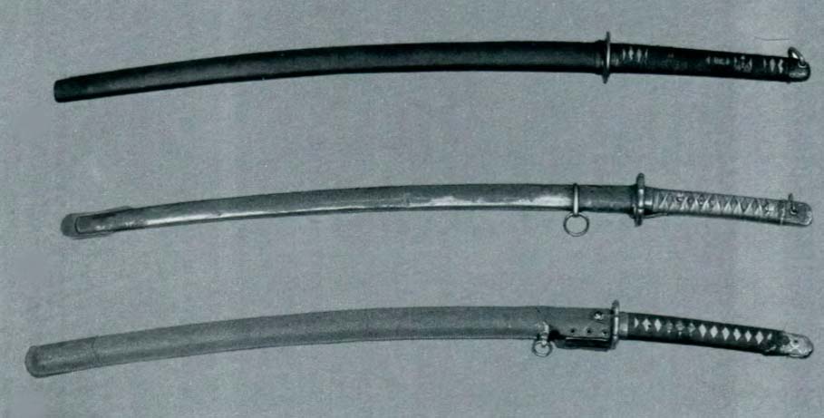Син-гун-то: 1 — образца конца 1944 г., ножны шероховатые, покрыты темно-коричневым лаком, детали из черненого железа, железная овальная цуба. Отсутствует коричневый темляк и кольцо крепления на ножнах; 2 — образца 1934 г. сержанта, цуба латунная, рукоять алюминиевая, имитирующая оплетку; 3 — армейского образца с ножнами в кожаном чехле (полевые ножны);