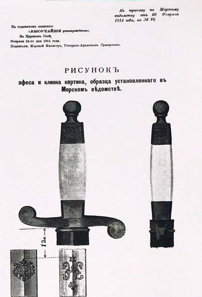В 1914 году образец морского кортика претерпел существенные изменения. Отныне на внешней стороне навершия рукояти предписывалось иметь рельефный вензель императора, в царствование которого владелец оружия был произведен в первый офицерский чин, по аналогии с утвержденными ранее эфесами офицерских шашек, сабель и палашей. Императорский вензель должен был изображаться также на клинке, в обрамлении растительного орнамента. Если рисунок вензеля был достаточно единообразен и у разных экземпляров мог отличаться разве что высотой рельефа и степенью проработки, то декор на клинке отличался большим разнообразием.