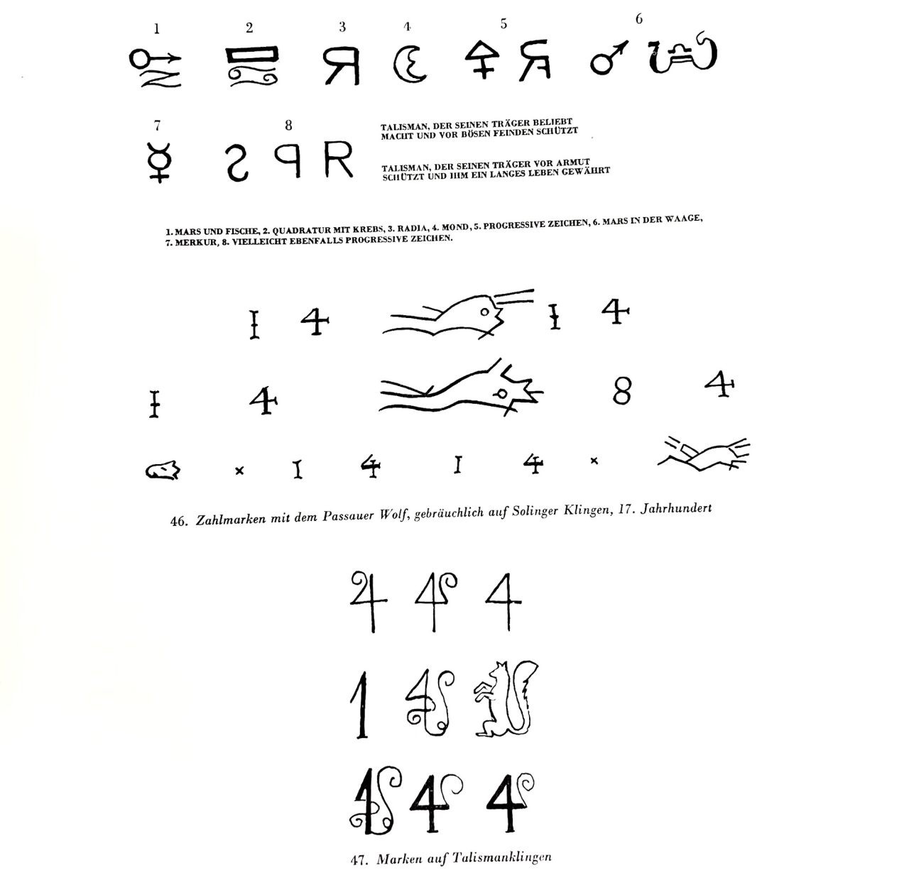 После более близкого рассмотрения «магического» характера первого упомянутого талисманного клинка, я заметил странное сходство с числом 1441. Так, цифра 4, хоть и считается несчастливой, похожа на знак Юпитера, счастливой планеты. Первый знак, который Рамбальди* считает знаком Юпитера, может быть 1 (счастливым числом), стилизованным таким образом, что напоминает белку, которую мы видим среди марок мастеров из Солингена с конца 16 века. И когда мы объединяем эти основные знаки, то есть стилизованную под белку 1 и две 4, похожие на знак Юпитера, они вместе образуют число 144, которое символизирует угол, который астрологи называют биквинтилисом и считают особенно эффективным.