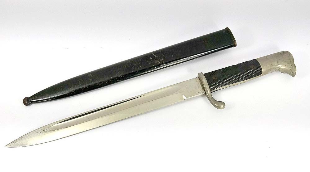 The bayonets of the Third Reich fall into two main categories: those designed for field or combat use, and those designed solely for traditional wear with ceremonial dress uniforms in parades and ceremonies. It is difficult to determine which of the two categories specific details or features belong to, as the field model is easily distinguished from the nickel-plated, ceremonial examples. German battle bayonets were made in various lengths depending on the period of manufacture. Longer models were from the World War I period, while shorter models were of later assembly.
