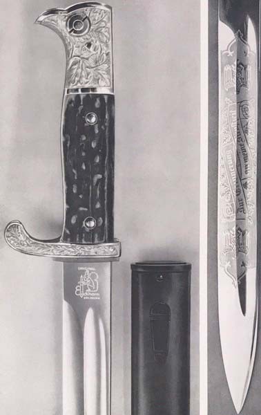 A parade long bayonet from the Third Reich period.Example of a hilt with a deer antler. A shortened bayonet from the Third Reich period.A rare example of a shortened bayonet with suspension and leather loop on the scabbard. The blade is engraved.