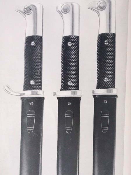 Three variants of the Wehrmacht parade bayonet. All models were nickel-plated and could be purchased with etched blades.