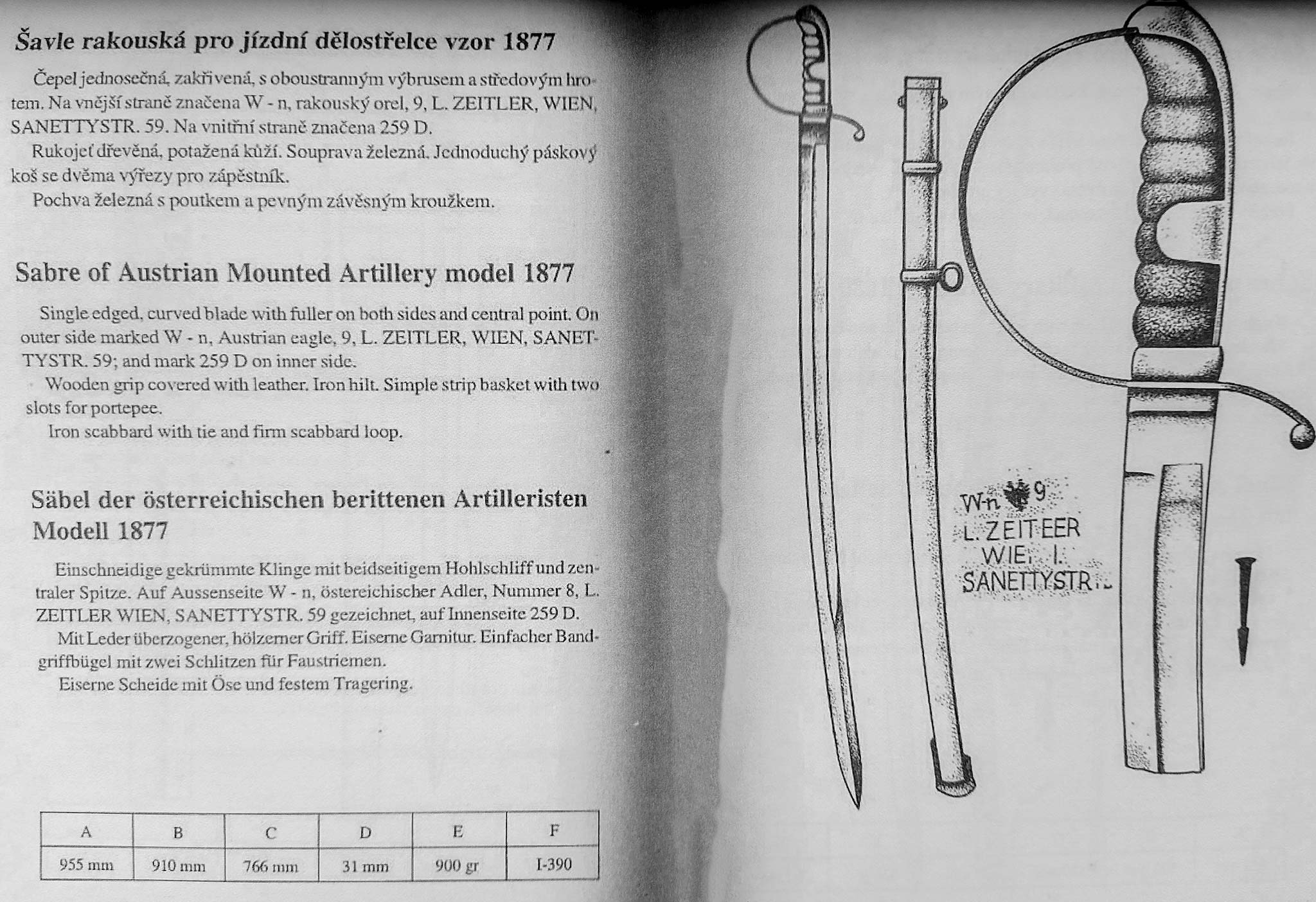 The blade is made of polished steel with hollow holes on both sides and has a back. The sheath has a fixed ring for carrying at the top and a loop for hanging on the back (wide) side of the middle medallion. There are shortened versions of the 1877 model that resemble the "landwehr gebirgstruppen" sabers.