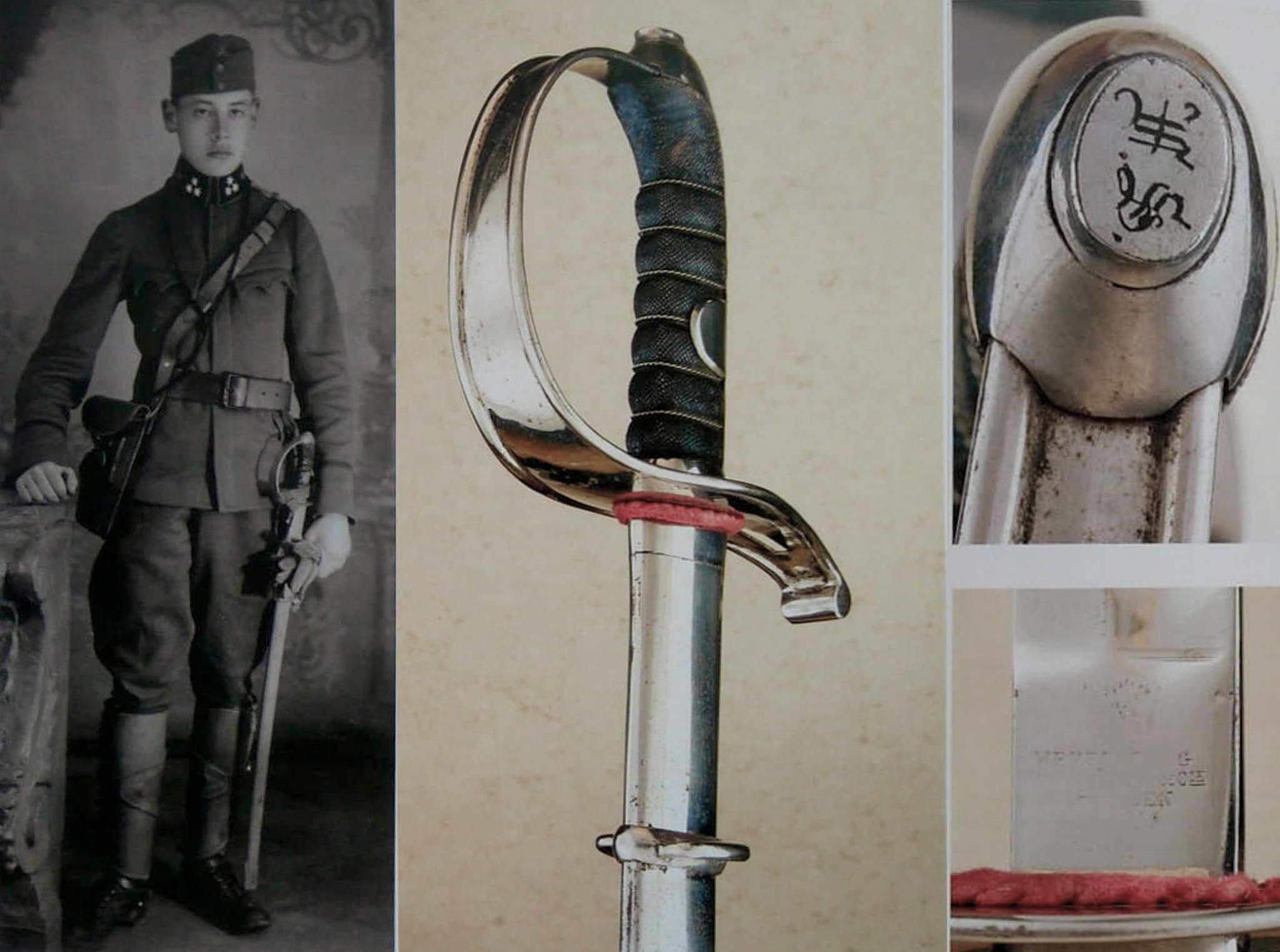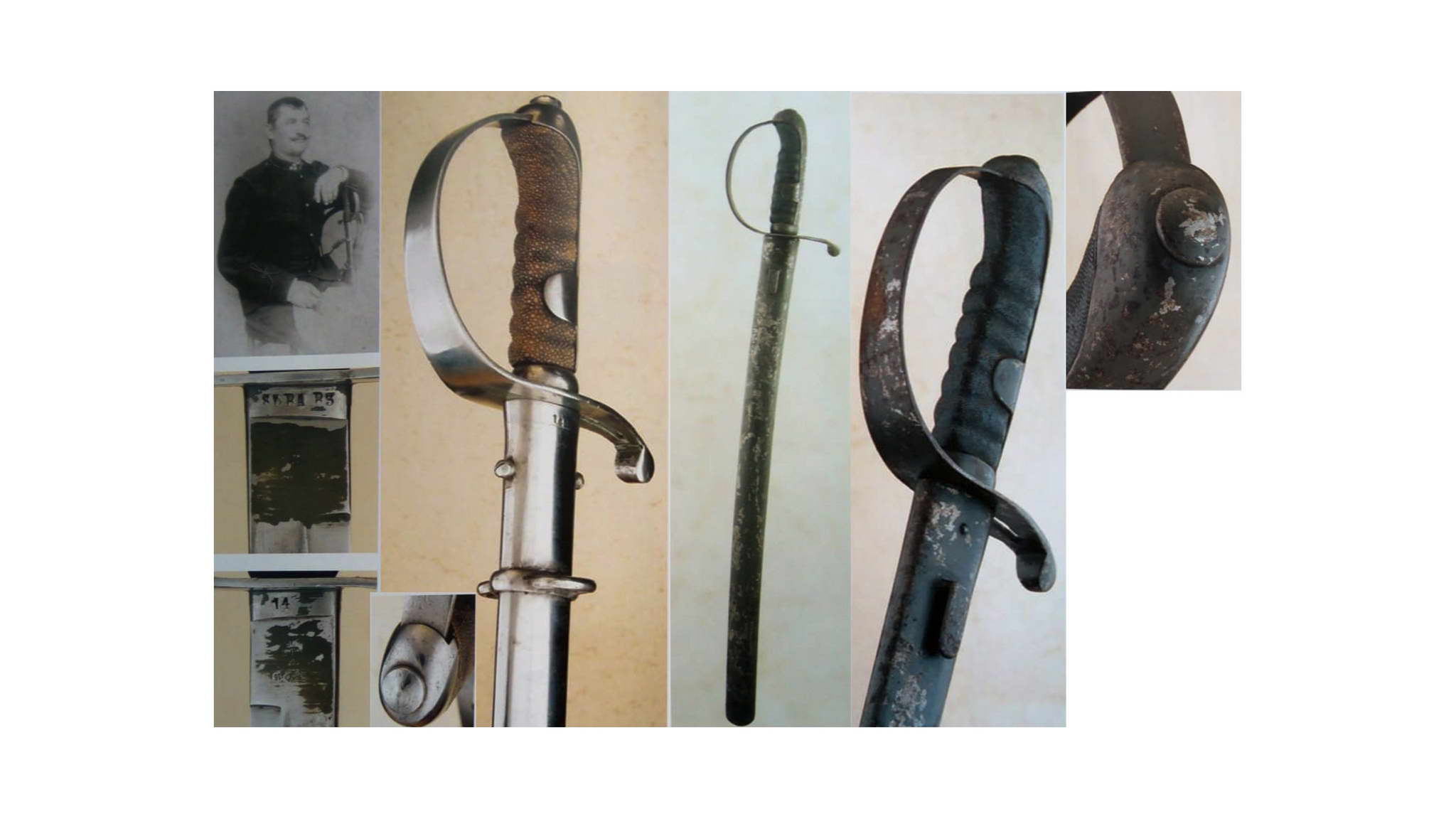 Left: Cavalry Sabre Model 1877 Standard Model "Light Version") – This sabre is shaped and sized by an army saber, but the handle is covered in leather, which may indicate that it was used by a non-commissioned officer. The upper medallion has double eyelets (back and front), and remnants of paint show that the sabre was probably painted olive green during World War I. There are several stamps on the blade and sheath.