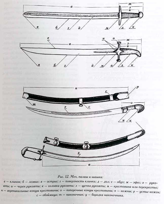 Occasionally, sabers have slightly curved blades with lobes, which are more characteristic of checkers. Blades of the Iranian type were produced in the village of Amuzgi and in other villages of Dagestan. The handles of all Dagestani sabers are also close to the Iranian ones. The similarity is expressed in the perpendicular arrangement of the head to the cutting and in the oblong shape of the four-reed head. The black handle of the Dagestan saber is different from the Iranian one – it is expanded at the base and gradually narrows to the head, in the section it has an oval cross-section.