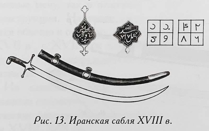 The average length of Iranian blades is 76-82 cm, weight – 500 g. The surface of the blade is smooth, the butt does not protrude, the lobes are rare, and the decorations are few. On the blades there are inscriptions in Arabic or Persian containing religious sayings, sometimes the name of the master and the date. Often among the inscriptions there is a square divided into four parts, each of which contains the letters b, d, u, x, the so-called bedukh, or the numbers 2, 4, 6, 8, corresponding to the ordinal number of these letters in the Arabic alphabet.