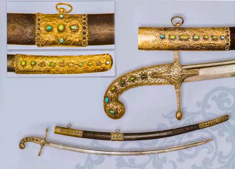 Most often, Turkish sabers are mentioned in the documents. Here are some typical descriptions: "shablya turkish"; "Turkish sabre, dressed under silver with puffs"; "Turkish sabre with silver undercut"; "sabre with a Turkish lanyard"; "a Turkish sabre, set in silver with gilded bugs." The two most detailed descriptions are as follows: "a Turkish sabre in silver all set and a sheath lined with stones with gilding"; "the sabre is Turkish, iron muser, and the sheath in silver is set and in the middle is green velvet."