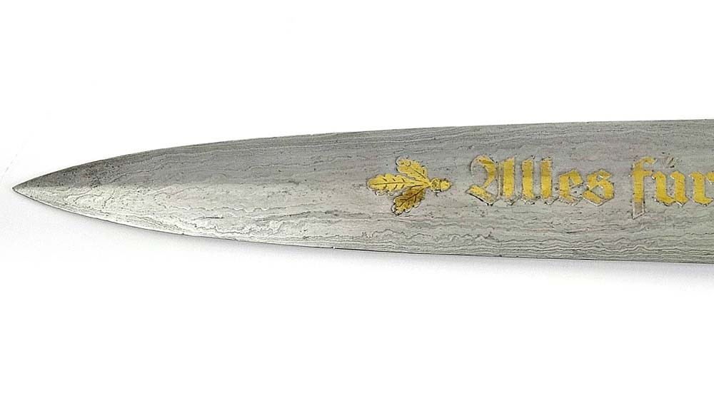 The SS Dagger of Honor with a Damascus blade, silver trims with an oak leaf pattern and a sheath covered with black leather. Such subjects were usually awarded only to the most senior managers.