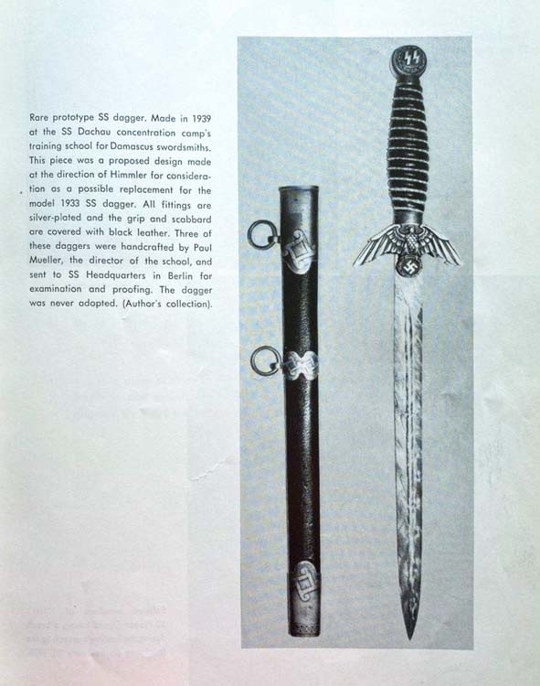 A rare prototype of the SS cortex. He was produced in 1939 at the training school of the SS concentration camp Dachau by blacksmiths of Damascus. This was a proposed design, made at Himmler's direction, for consideration as a possible replacement for the 1933 SS dagger. All accessories are covered with silver, the handle and sheath are covered with black leather. Three of these daggers were handmade by Paul Müller, the school's principal, and sent to SS headquarters in Berlin for inspection and approval. The dagger was never accepted. (Private Collection).