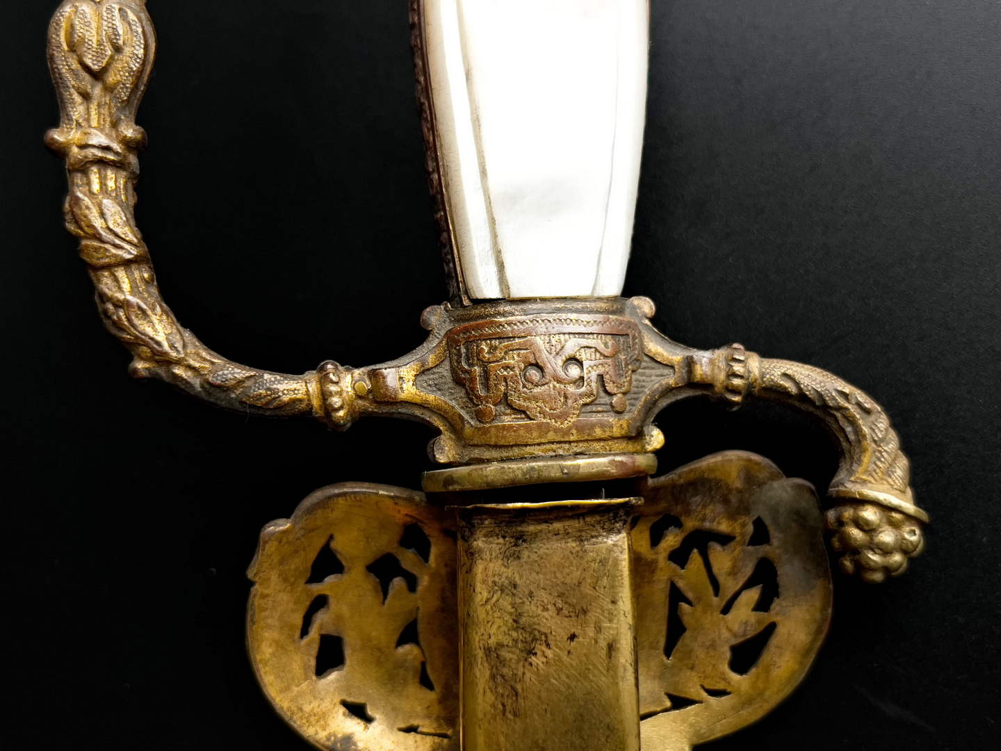 The sword of an officer of the School of Military Engineering in Saint-Etienne had a straight blade with a three-edged blade. The handle was made with mother-of-pearl overlays and decorated with brass or silver details. The emblem of the school or symbols were often depicted on the ephesus.