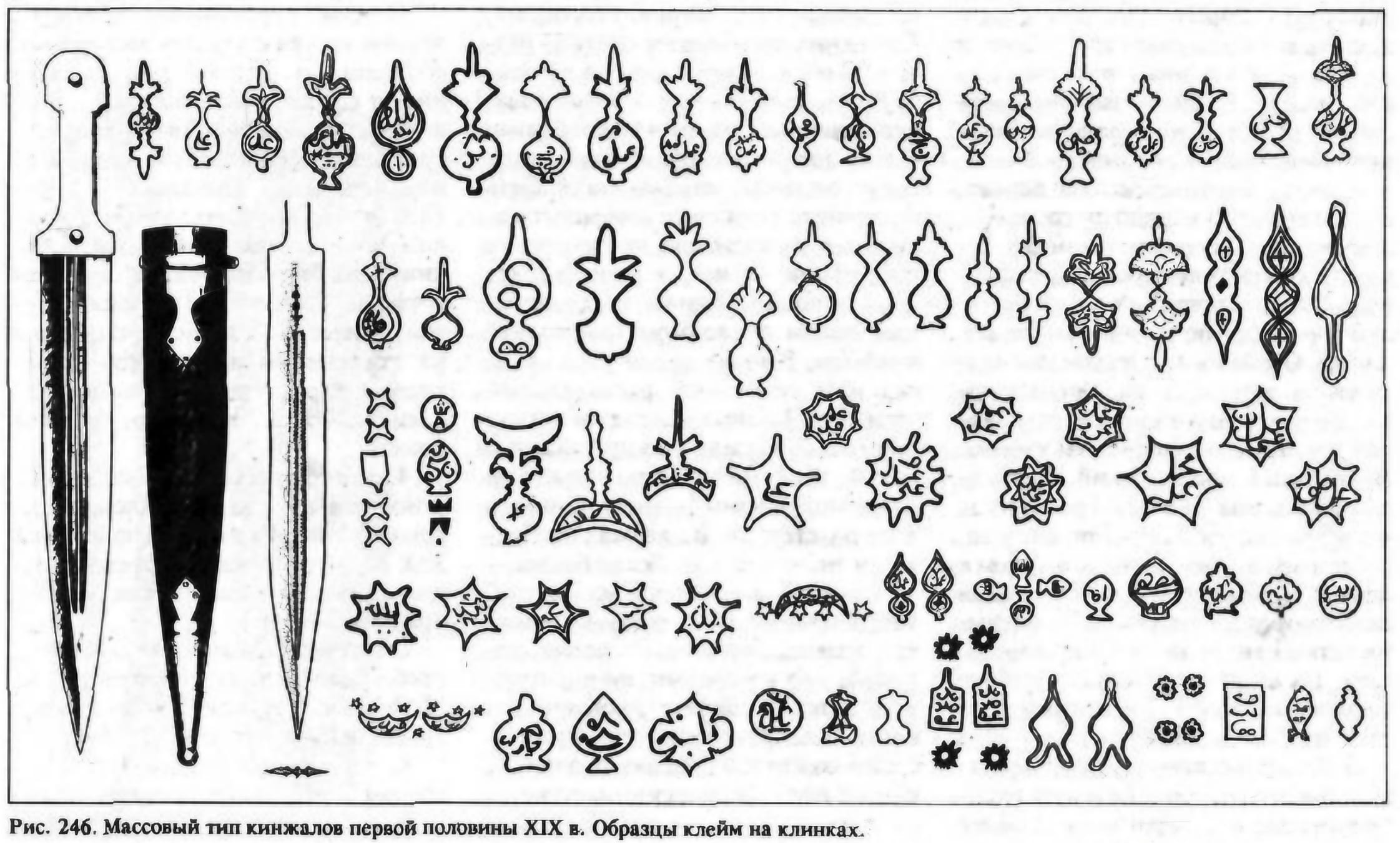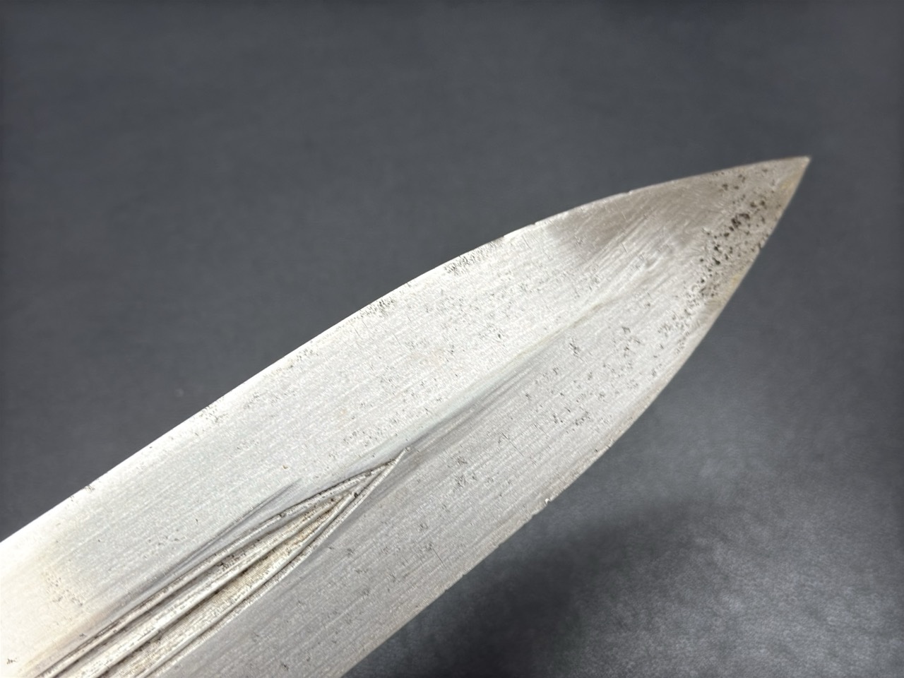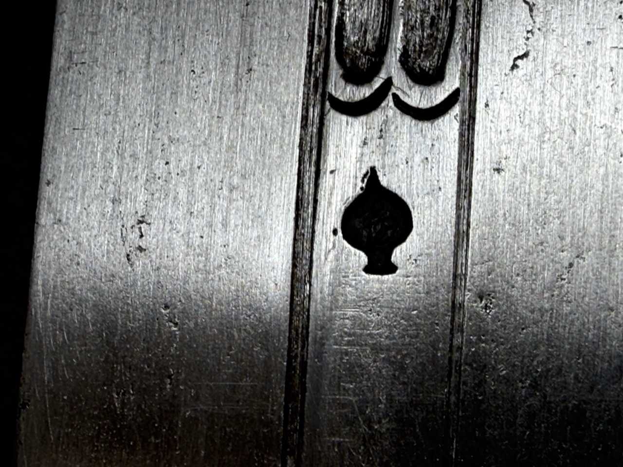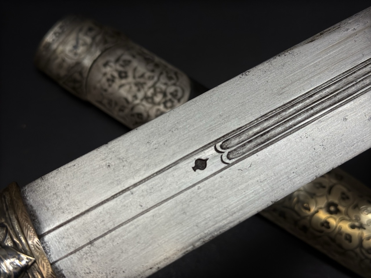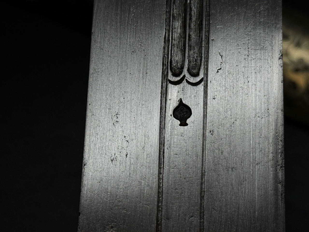 Клинок стальной, двулезвийный, с выраженным долом по центру для облегчения конструкции и повышения жесткости. Имеет характерную форму, широкую в основании и сужающуюся к острию. На клинке присутствует клеймо в виде стилизованного знака (каплевидная метка), что служит идентификатором мастера или центра производства. Лезвие демонстрирует следы исторического бытования и заточки.