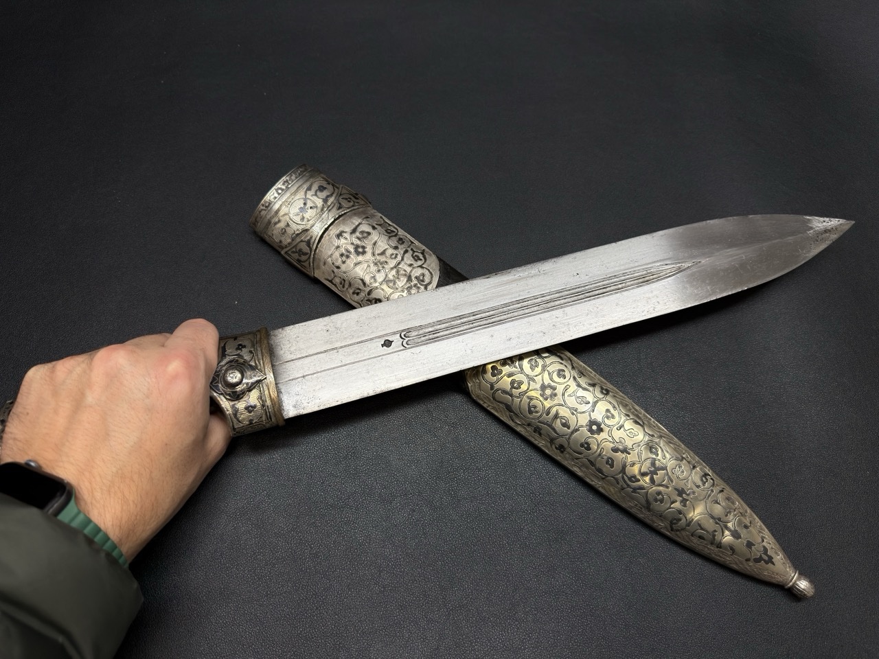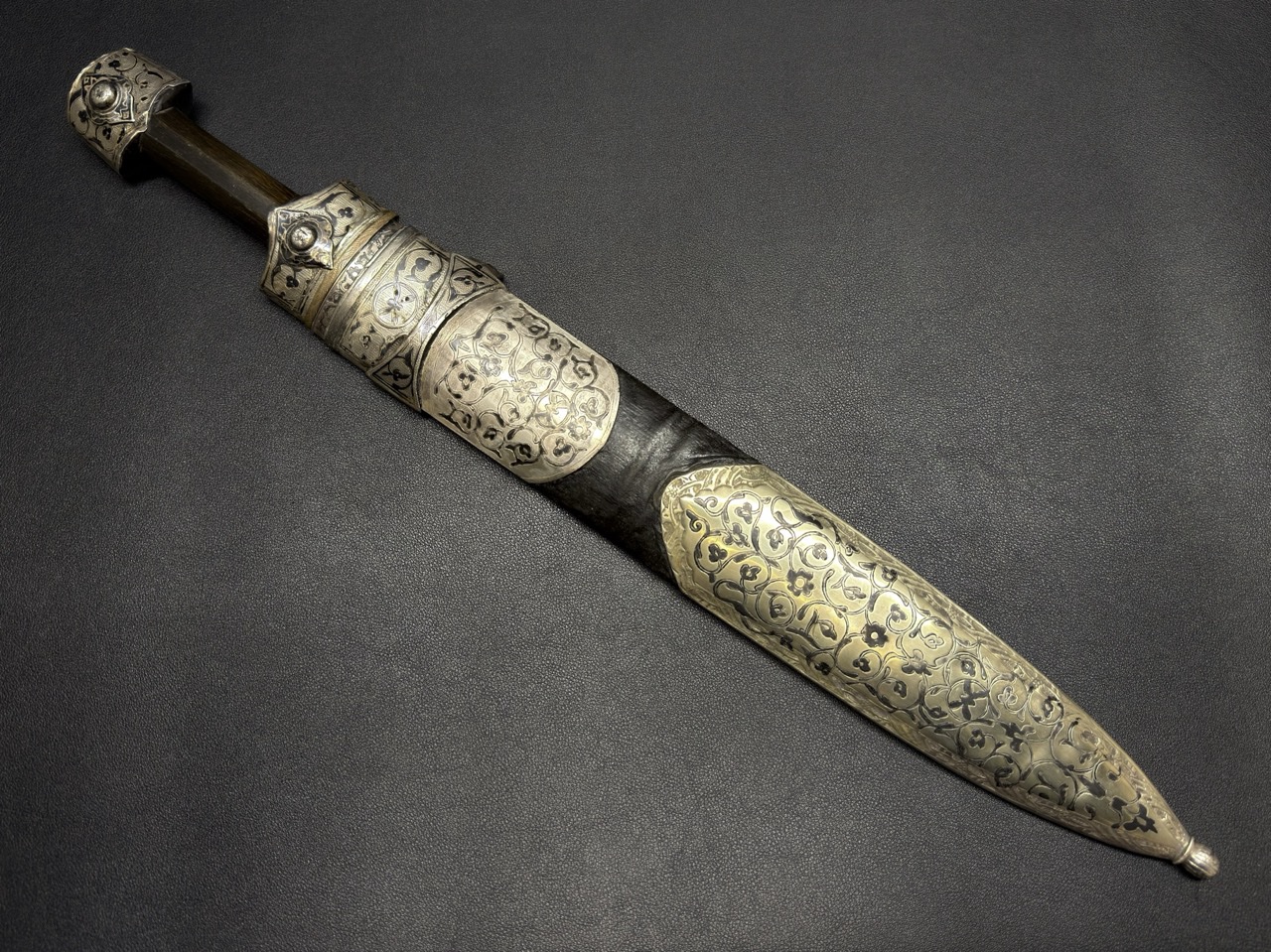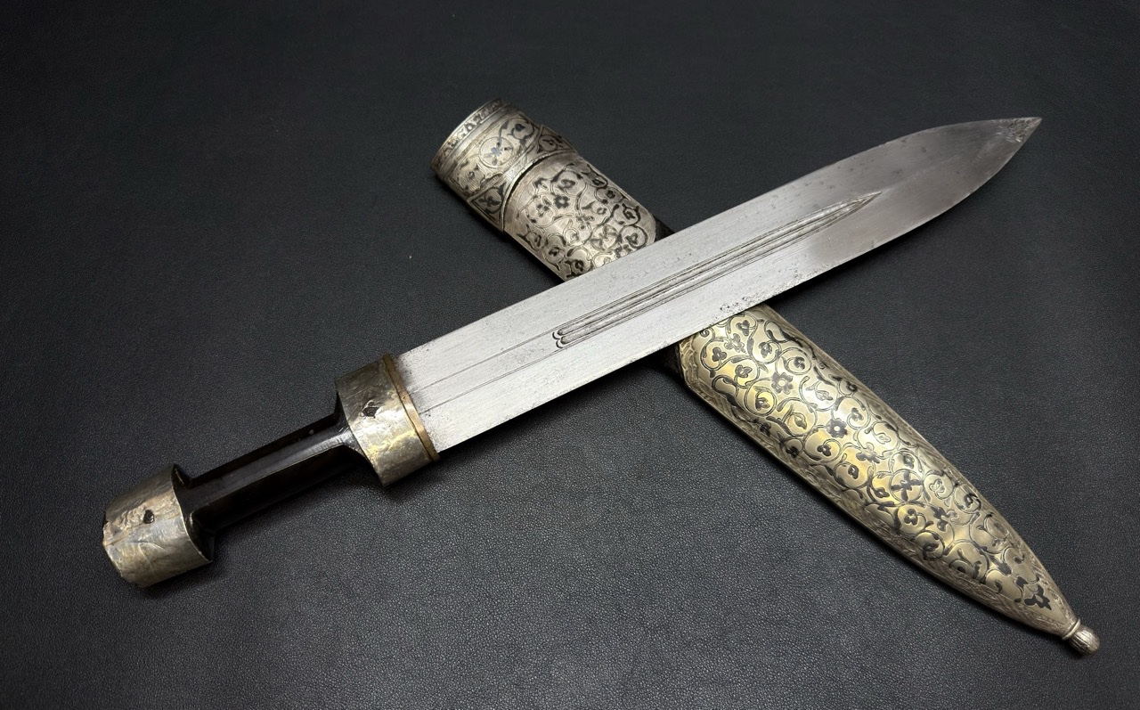 | Кама: Название «кама» является общим для данного типа кинжала, который был неотъемлемой частью вооружения и одежды горцев Кавказа. Чернение (Ниелло): Техника ниелло была доведена до совершенства в таких центрах, как Тифлис (Тбилиси) и Кубачи. Использование этой техники на кинжале подчеркивает его высокий статус и коллекционную ценность. Аджарский Тип: Аджаро-Гурийские кинжалы часто отличаются более широким клинком и особой формой серебряных оправ, что позволяет выделить их среди общих кавказских образцов.Кинжал был самым распространенным видом холодного оружия на Кавказе на протяжении XVIII–XIX веков. Он был не просто оружием, но и символом чести и достоинства. В XIX веке, в период активных контактов с Российской империей, спрос на высококачественные кинжалы был очень высок. Этот антикварный предмет отражает богатство оружейных традиций Кавказа, где производство оружия сочеталось с ювелирным искусством. |