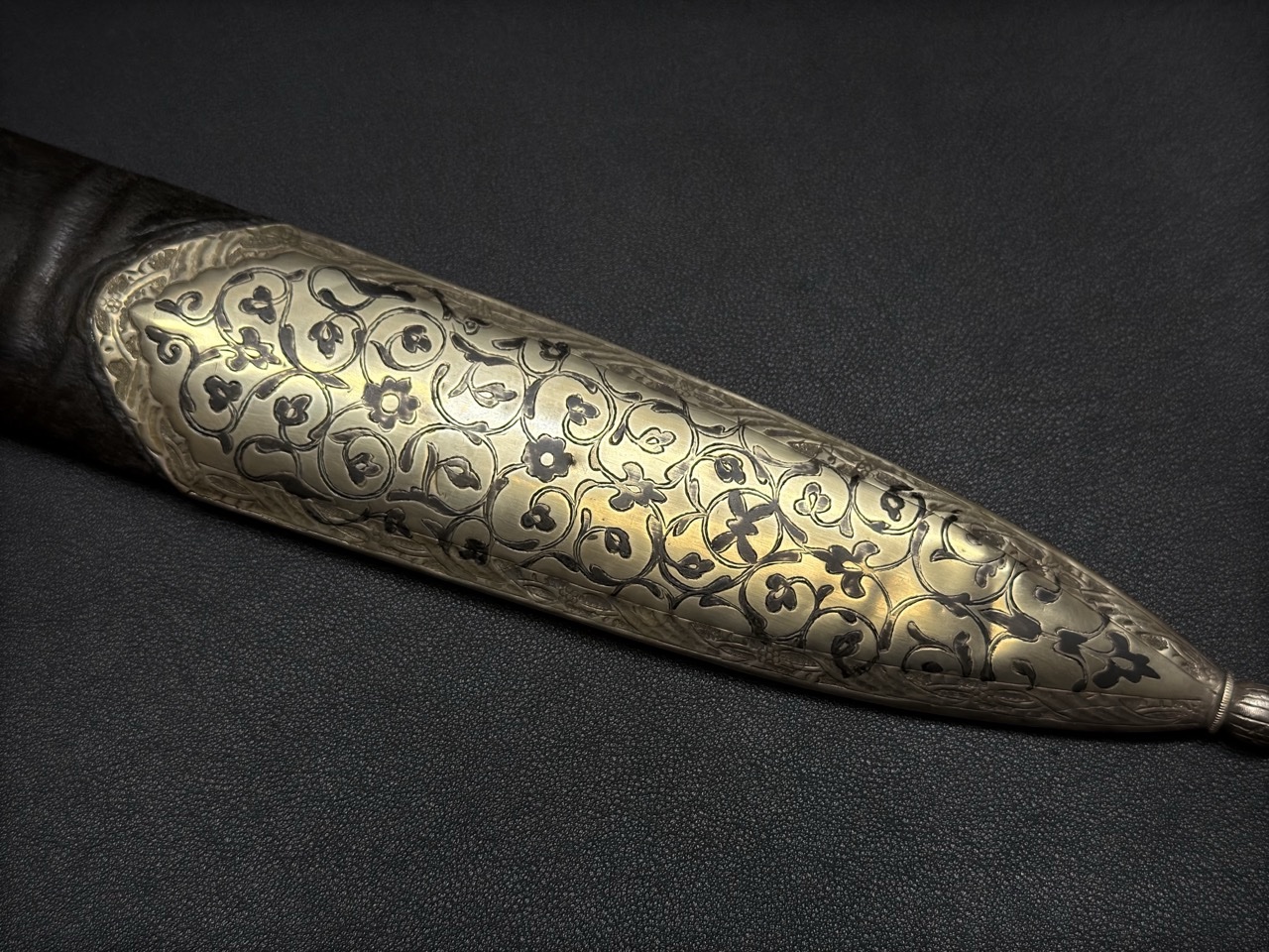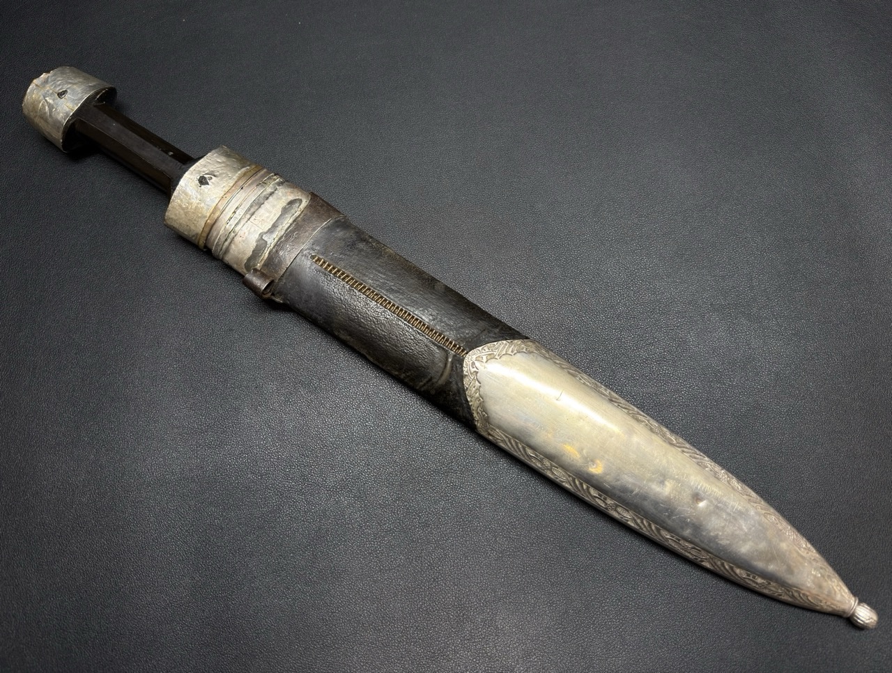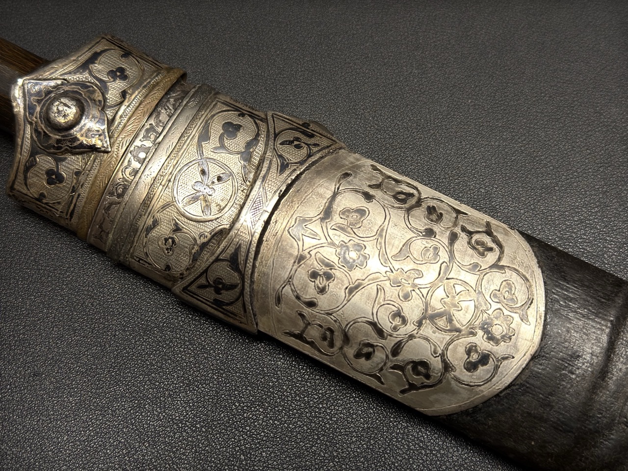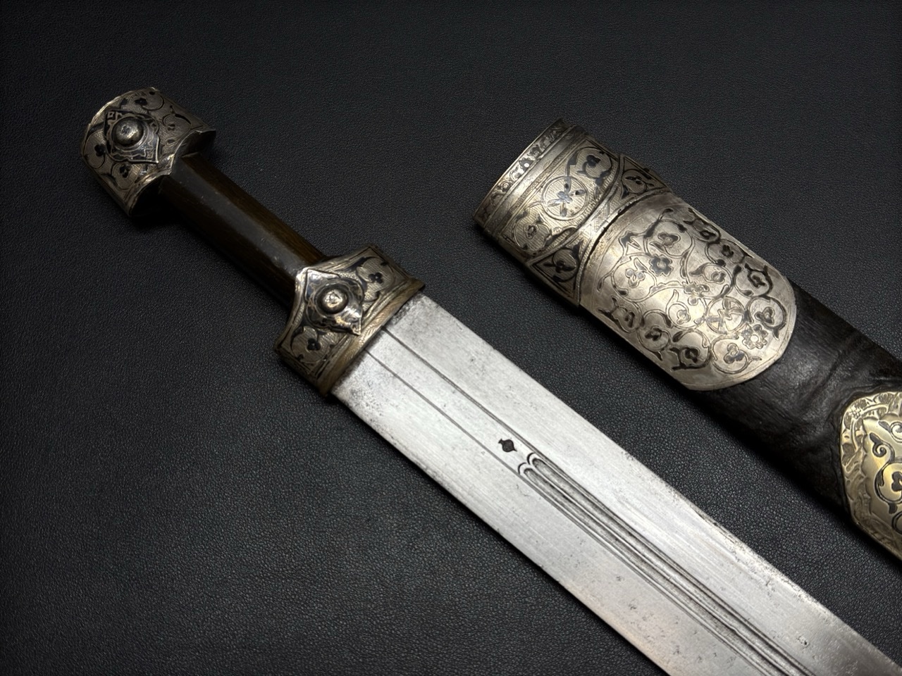 Деревянная основа ножен покрыта, кожей. Устье и наконечник ножен изготовлены из серебра. Серебряные части богато декорированы сложным, характерным для грузинского/аджарского стиля черненым орнаментом. Декор ножен часто повторяет узор на рукояти, создавая единый ансамбль. В данном случае видни следи старой реставрации стакана и устья ножен.