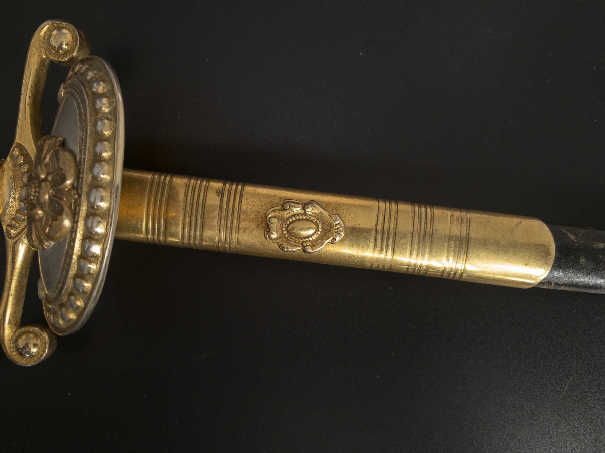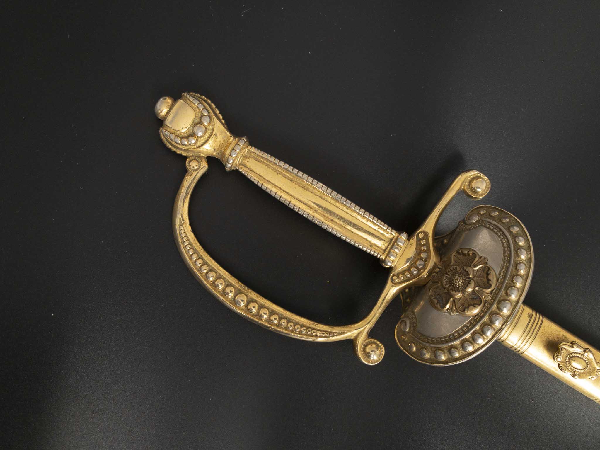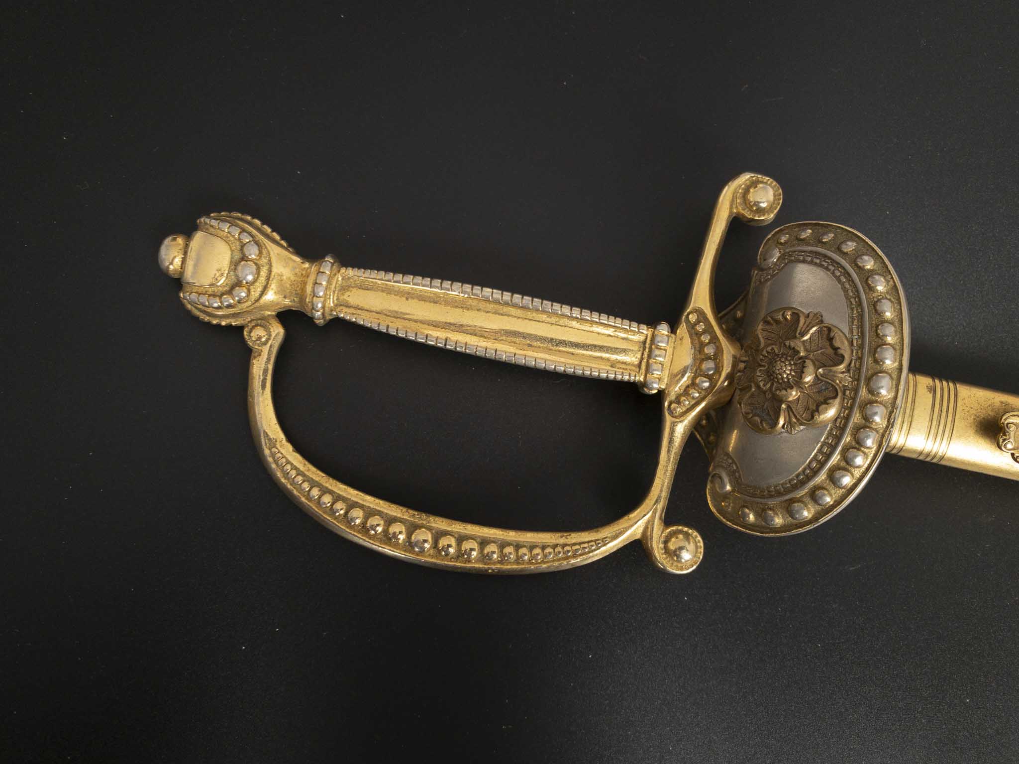 Эфес латунный, состоит из рукояти и гарды. Рукоять четырёхгранная, с фасками и продольными долами. Навершие выполнено в виде вазы с рельефными шариками. Гарда состоит из одной защитной дужки, которая плавно переходит в крестовину. Концы крестовины округлые и загнуты по направлению к клинку. на перекрестье располагается посеребренный декоративный щиток на котором присутствует выпуклое изображение Тюдоровской розы. По краю щиток украшен шариками разного диаметра. Все детали эфес позолоченные.