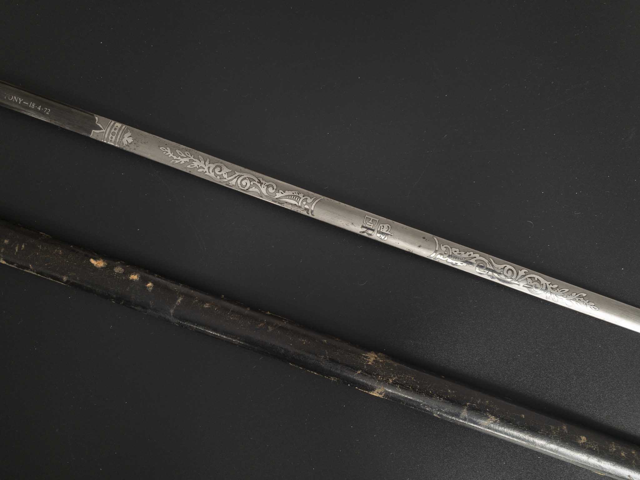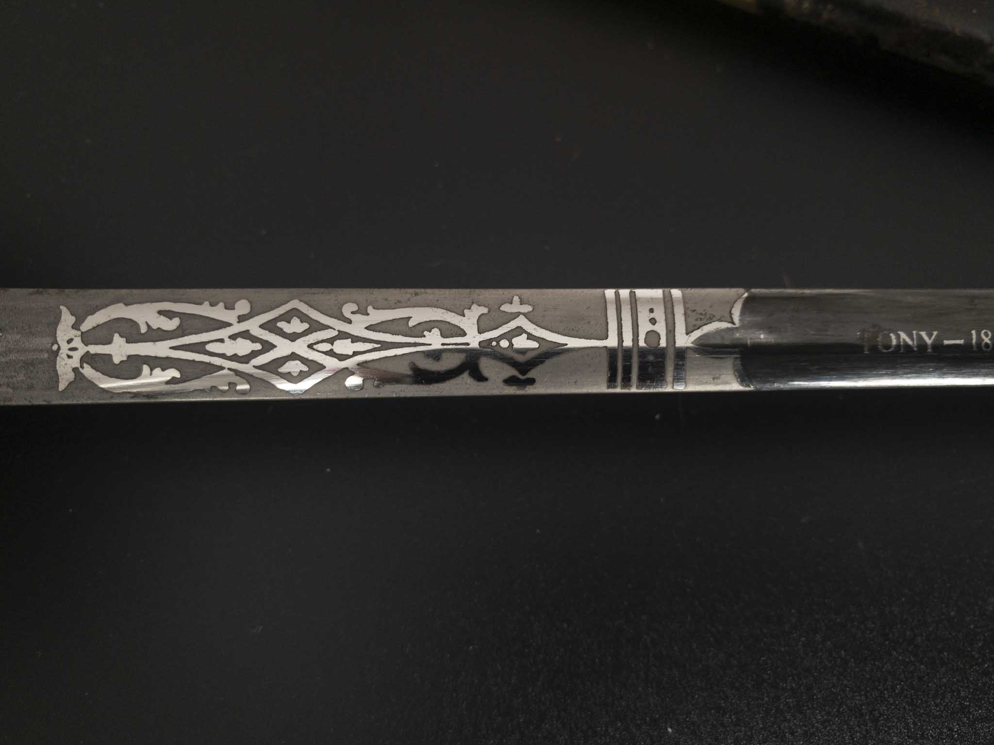 Клинок стальной, прямой, двулезвийный, без долов. Клинок украшен травлеными орнаментами на растительную тематику и вензелем королевы «Е2» Елизаветы 2, также на клинке на пяте по обе стороны травлением нанесено клеймо производителя «BY APPOINTMENT WILKINSON SWORD LONDON MADE IN ENGLAND». Ближе к центру клинка по обе стороны в обрамлении на черном фоне присутствуют надписи «TONY 18*4*72» а на оборотной стороне «JENNY»
