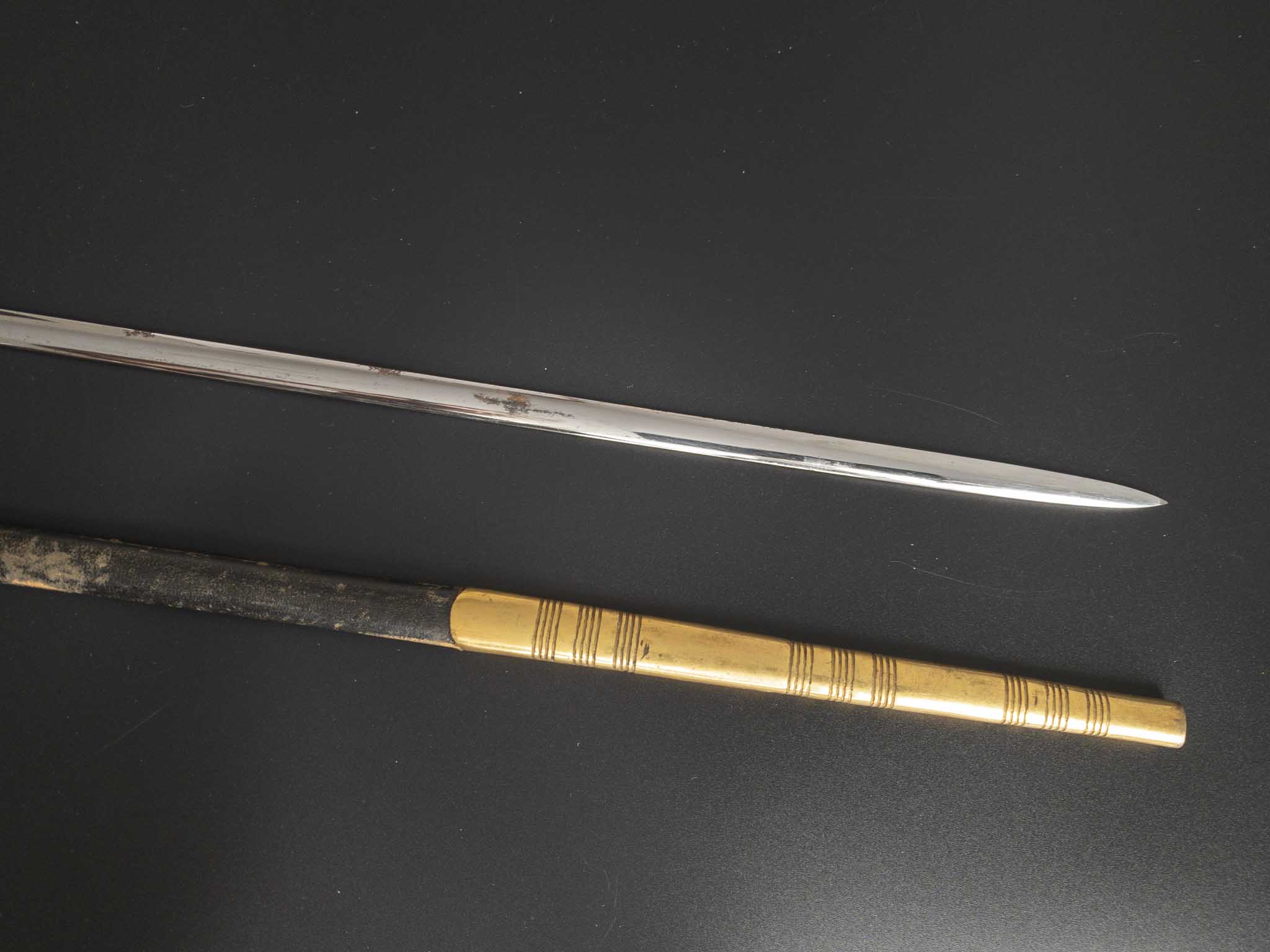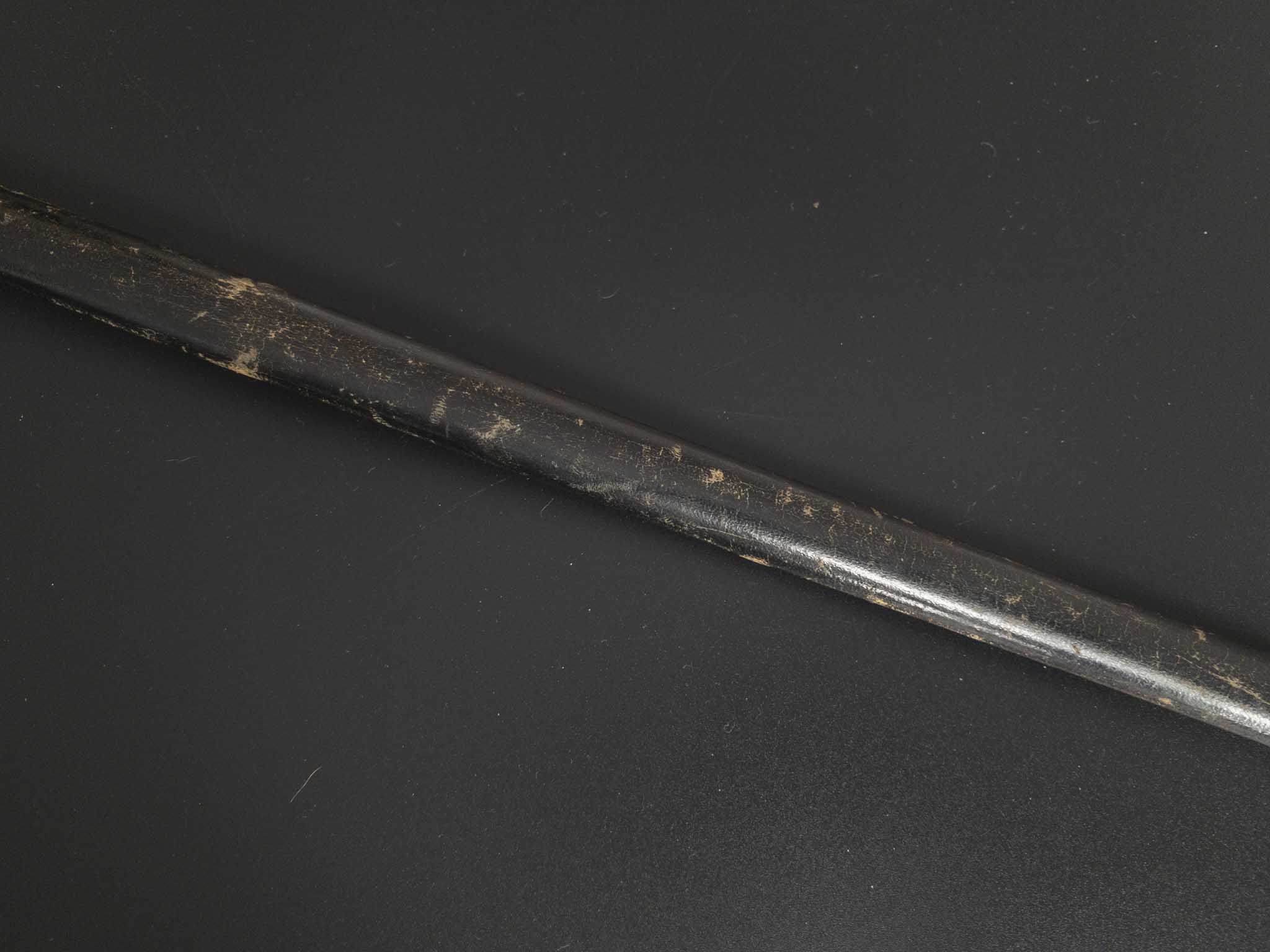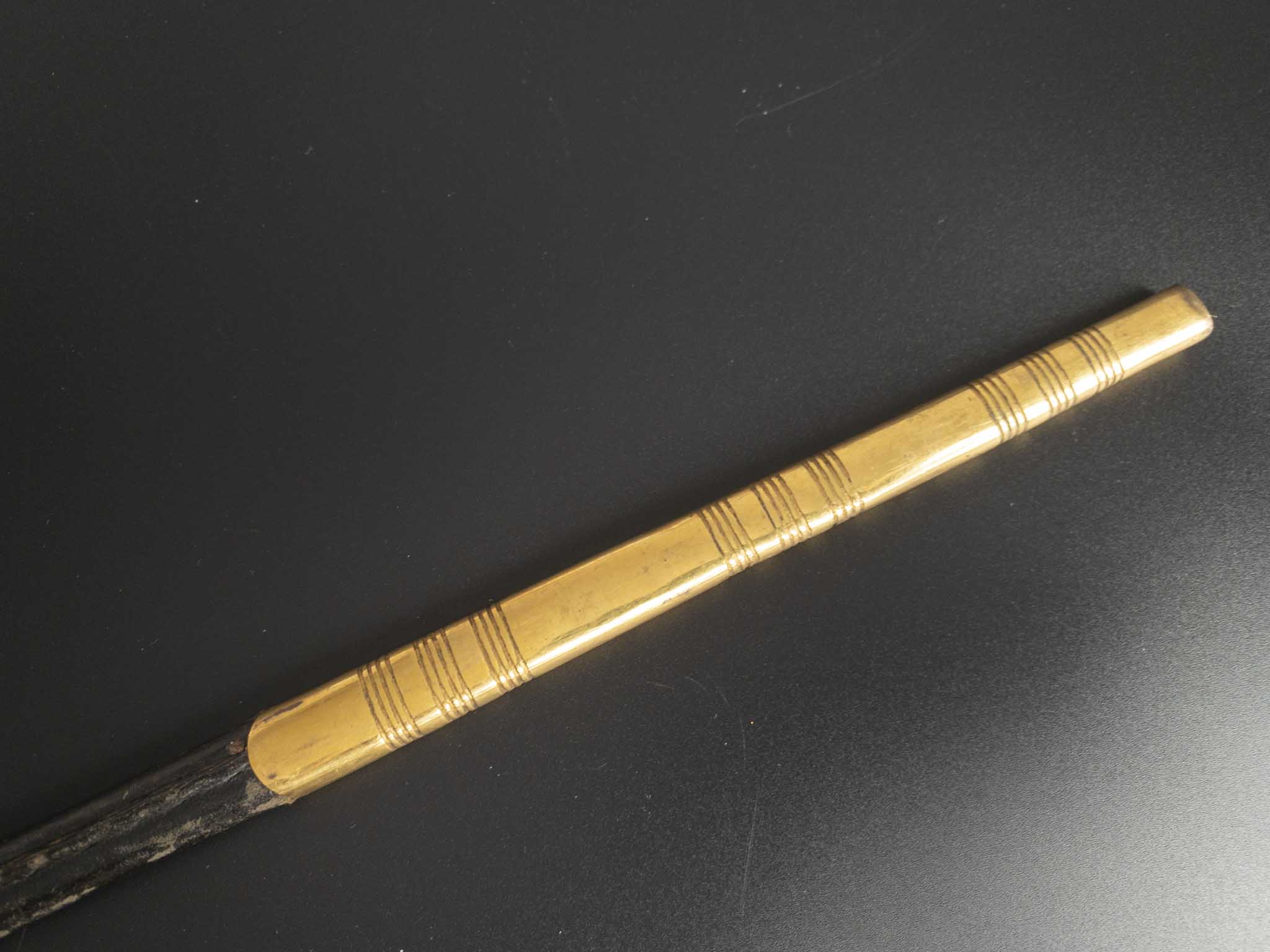 Ножны кожаные с латунным прибором, состоящим из устья со шпеньком и наконечника, прибор ножен украшен геометричными поперечными линиями, шпенек украшен тиснением в растительном стиле.