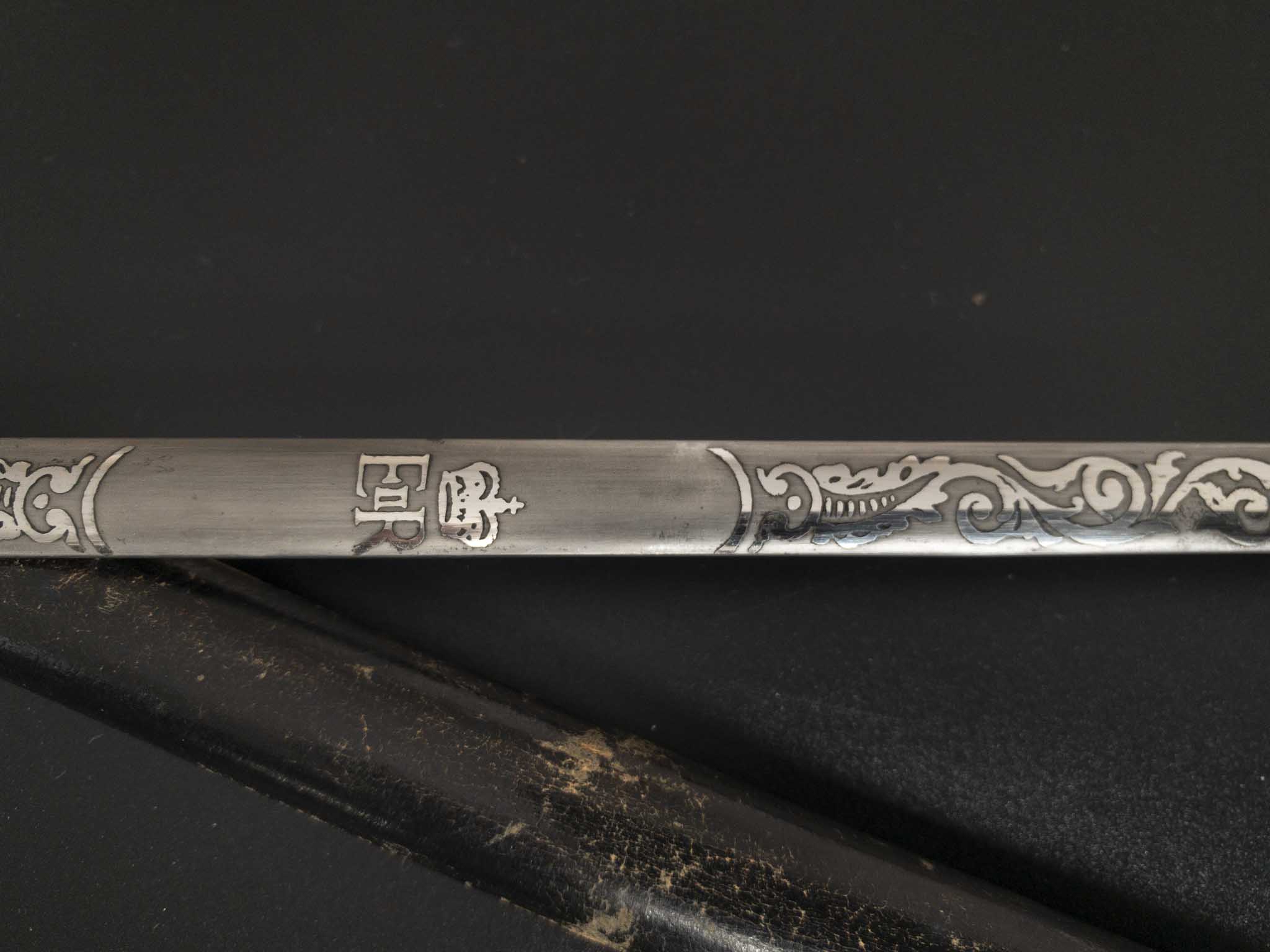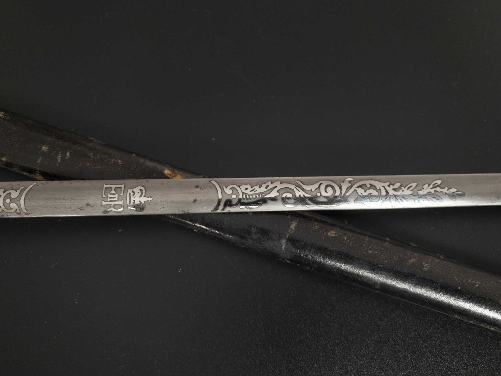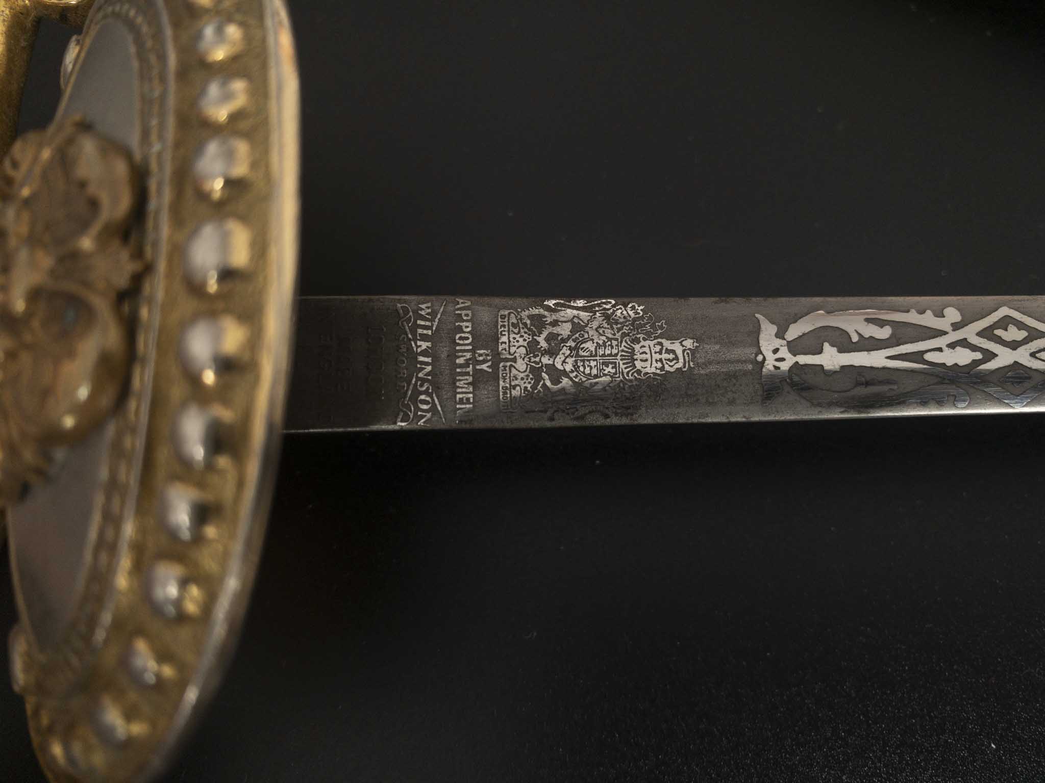 На пяте клинка по обе стороны вытравлена надпись «BY APPOINTMENT WILKINSON SWORD LONDON MADE IN ENGLAND» в переводе на русский «По предварительной записи меч Уилкинсона Лондон, сделанный в Англии»