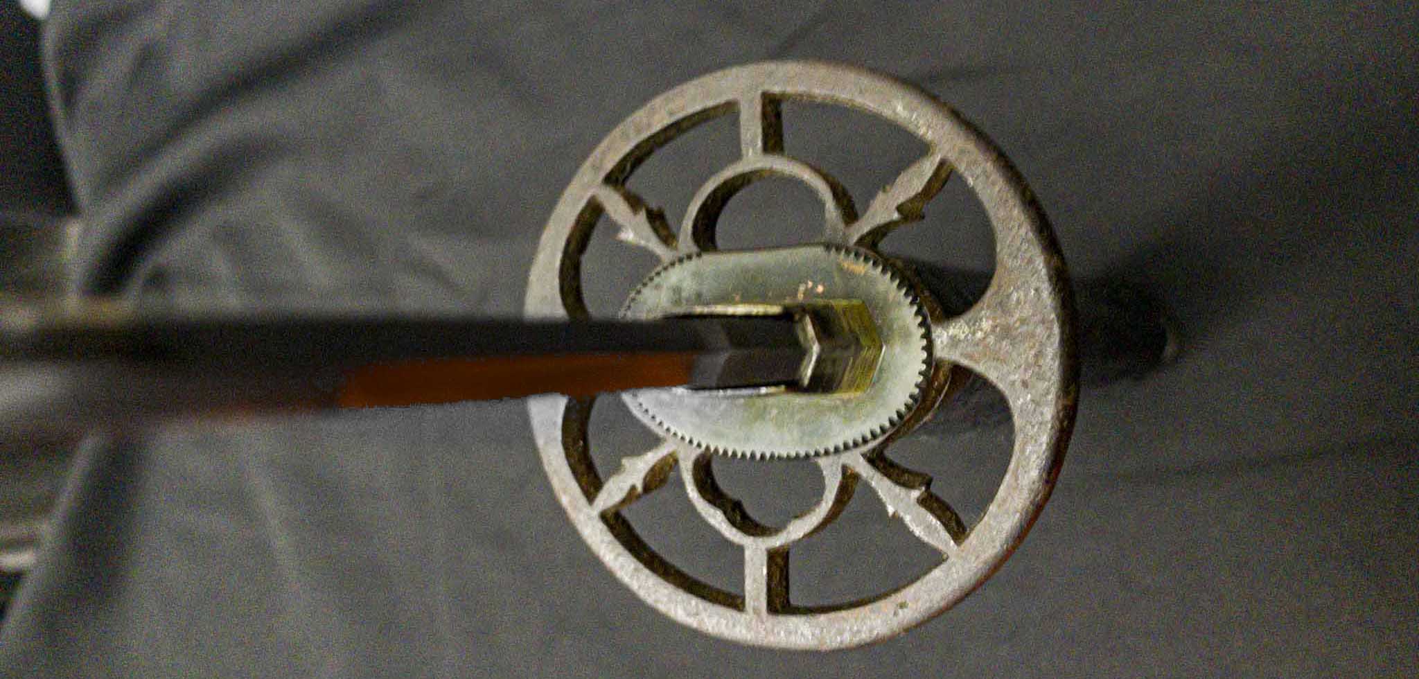 Цуба стальная, круглой формы с замкнутым «Хицуана» (отверстиями для когатаны и когай) оформленная прорезным орнаментом в виде стрел, направленных в центр.