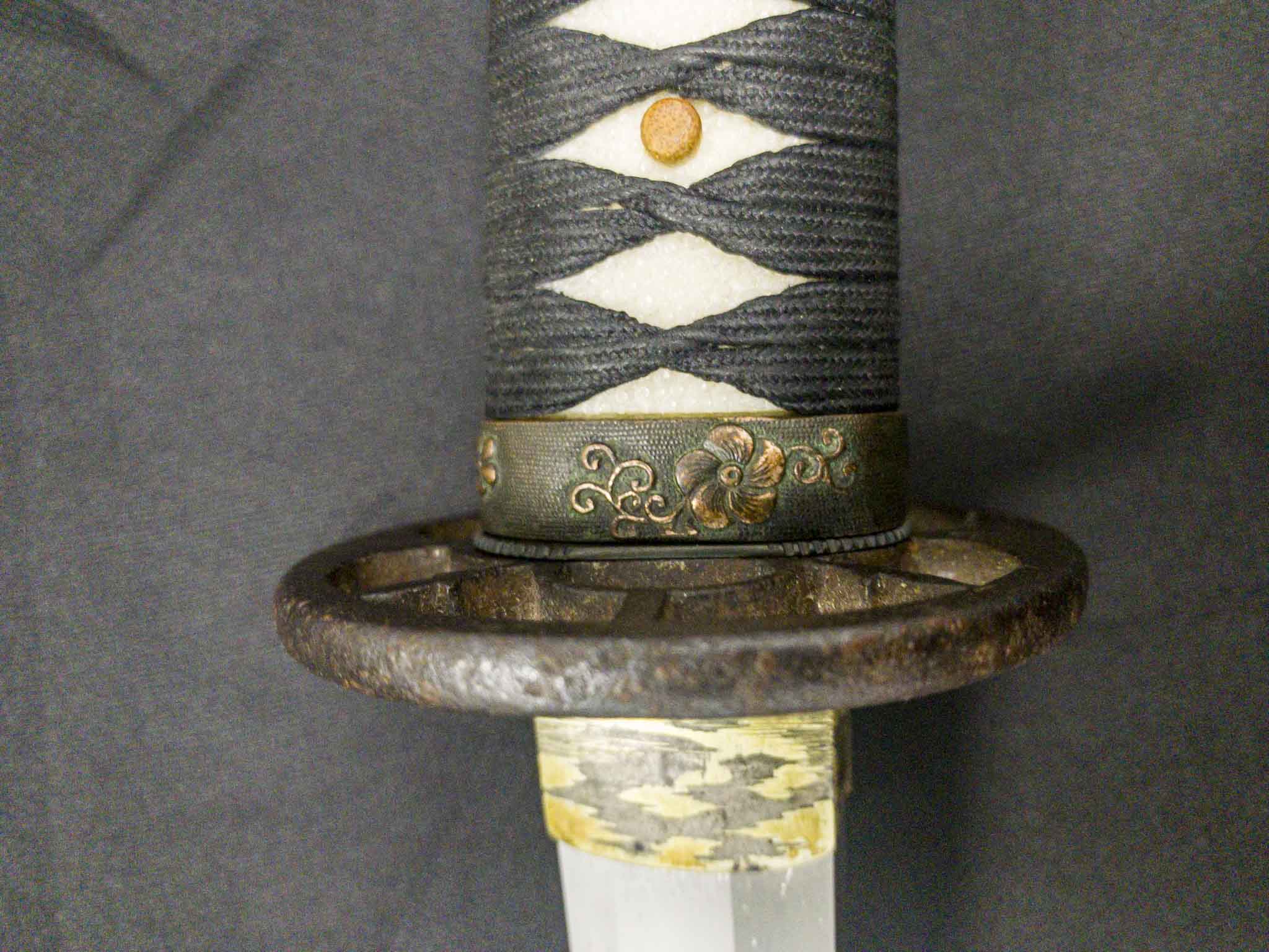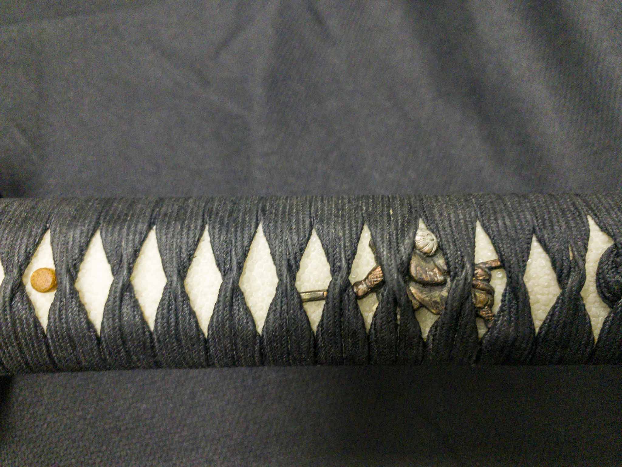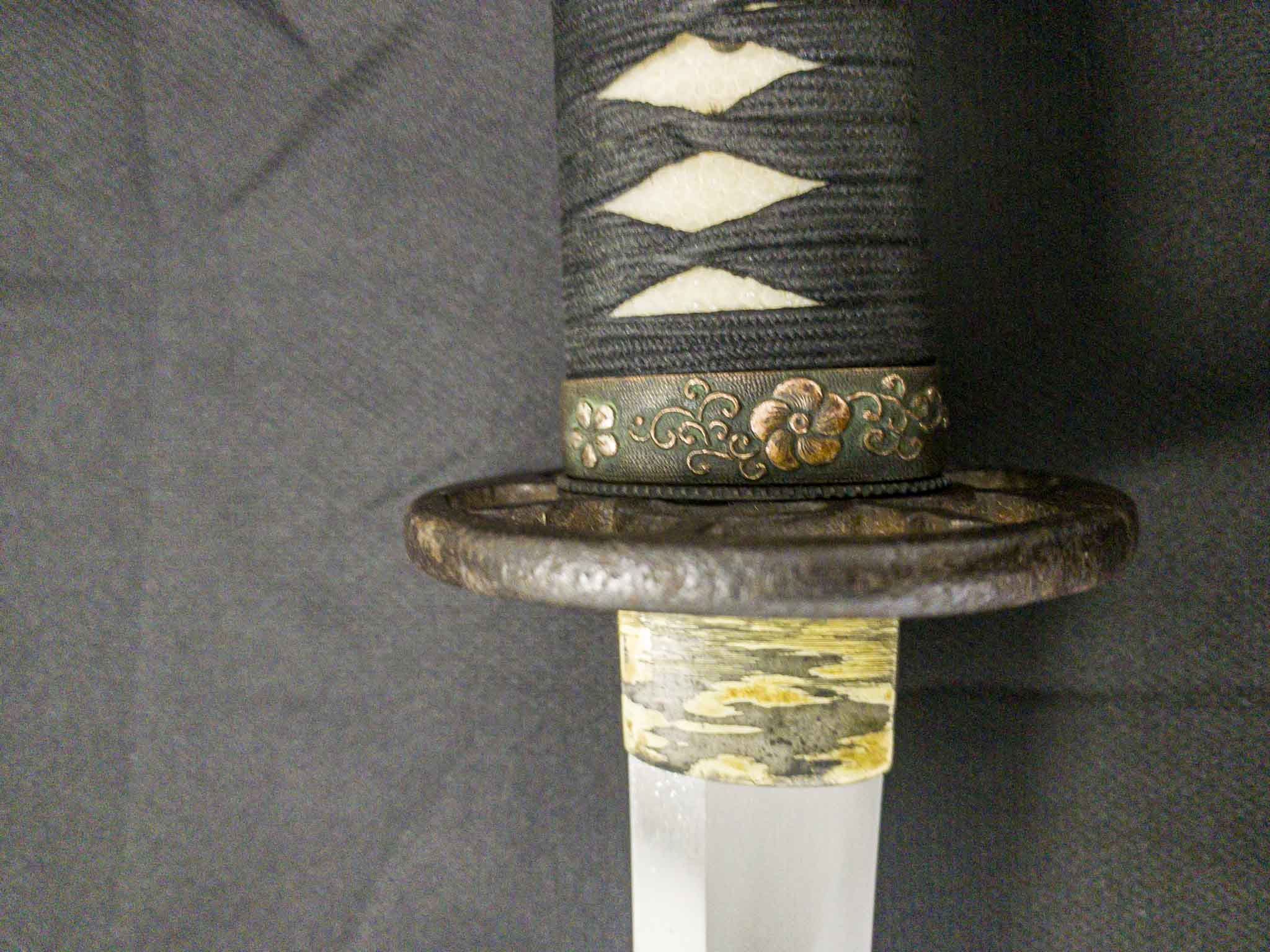 Рукоятка (Цука) деревянная обтянута кожей ската (самэ), а также поверх ската особым способом обмотана тканью. На рукоятки по обе стороны рукоятки под тканью можем заметить (мэнуки) медного сплава с изображением самурая держащий копье. Навершие «касира» поверхность украшена точечным орнаментом, а также изображением трех играющих козочек, козочки и отверстия для шнура украшенные позолотой. Обоймица «фути» украшена изображением растительного орнамента.
