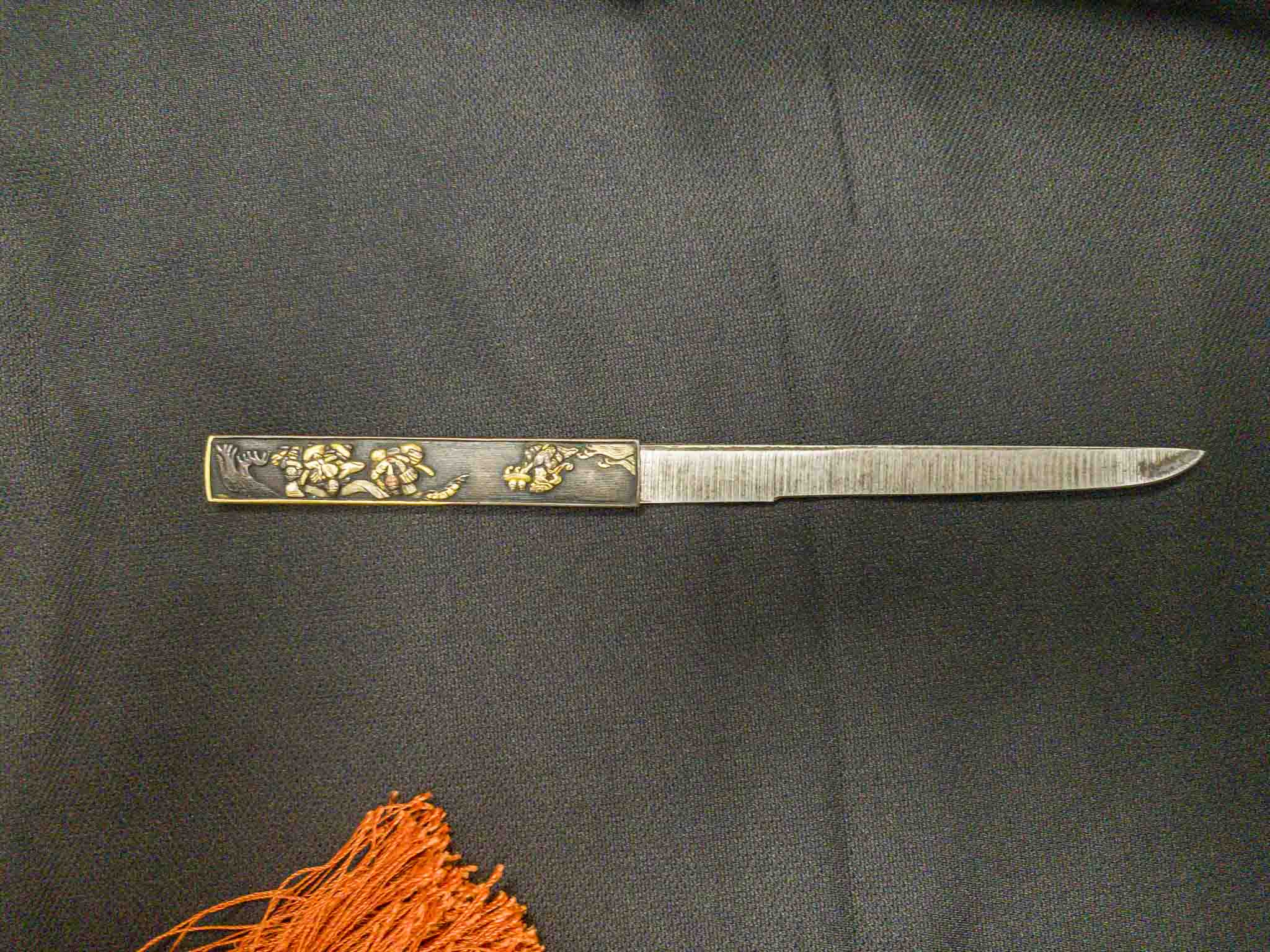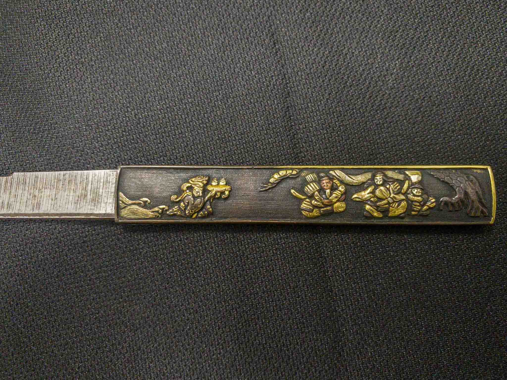 Косираэ (Повседневная одежда меча): Ножны (Сая) деревянные выкрашены в чёрный цвет, на задней части ножен выступает (куригата) — проушина на задней стороне ножен, на ножнах надет шнур «сагэо» зеленого цвета. В ножнах на лицевой стороне имеется отверстие для ножика «когатаны», а также сам ножик состоящий и двух частей рукоятки и клинка. Рукоятка когатаны, «кодзука» сделана из медного сплава с декорированным изображением самураев на отдыхе, объекты украшены позолотой, фон точечный «нанако».