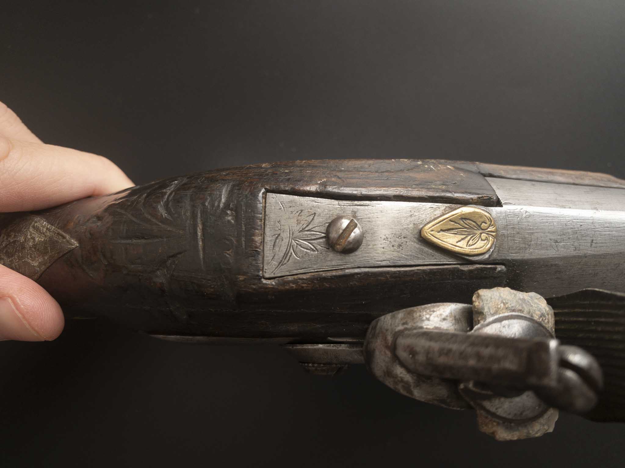 Спинка рукояти украшена фигурной ромбической рельефной прорезной пластиной. Ложе пистолета деревянное, украшена резным орнаментом ( видны остатки). Замок кремневый, ударный, не украшен, возможно изображения были с полированы. Ответная часть планки латунная. Скоба латунная. Ствол крепится к ложе винтом на хвостовике ствола. Рукоять завершается латунным набалдашником с выпуклой накладкой украшенной-пуговкой.