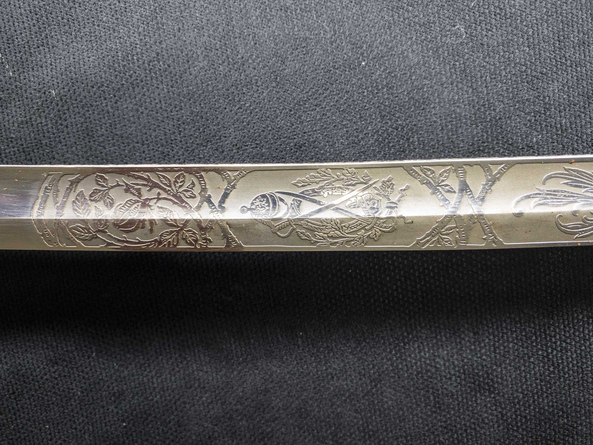 Описание: Клинок плоский, средней кривизны, однолезвийный, с одним широким долом вдоль обуха на 2/3 длины. В поперечном сечении пятигранный. Линия заточки лезвия чётко выраженная, пята плоская без уступов. Остриё копьевидной формы. Кромки лезвия притуплены. Начальная часть клинка на 1/3 длины украшена изысканным, глубоко проработанным двухсторонним травлением с чёткими краями.