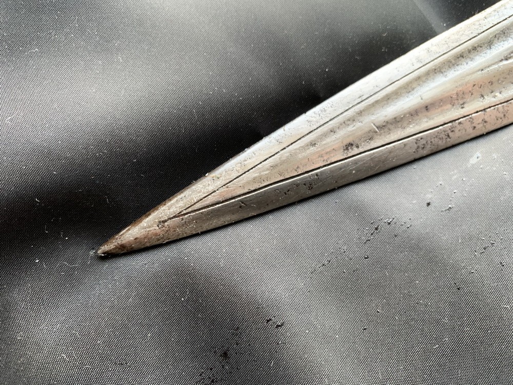 Сам клинок очень длинный 46 см, клинок прямой двулезвийный, На данном клинке с лицевой стороны 2 больших дола ближе к острию и один меленький дол который идет от пяты кинжала обрывается спустя 7 см и дальше идут 2 небольших дола, с обратной стороны на клинке 2 больших дола ближе к острию и 2 небольших дола по центру.