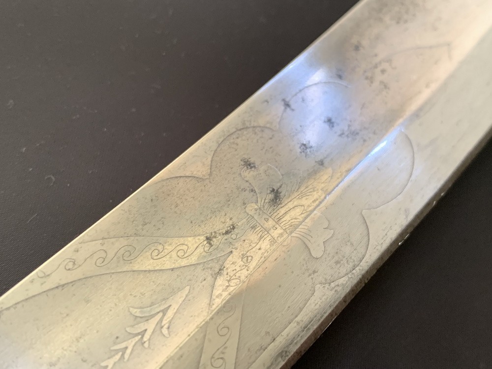 Клинок сабли стальной, со средним изгибом полосы, выполненной методом ручной (возможно машиной) ковки с последующей доработкой ее поверхности. В основной своей части клинок широкодольный, (долы получены фрезерной обработкой, впервые примененной в Германии в 17 веке и были предназначены для облегчения веса клинка) с заточенной внутренней кромкой (боевая часть) и тупым плоским обухом. Боевой конец расширен (по сравнению с остальной частью), пята имеет прямоугольную площадку. Клинок богато украшен травлением в виде растительного орнамента и военных мотивов. По своим боевым качествам данный клинок предназначался для односторонних рубящих ударов, а также для колющих выпадов.