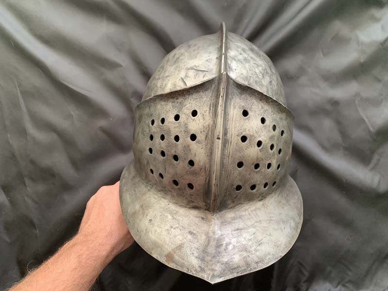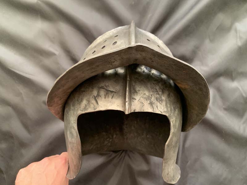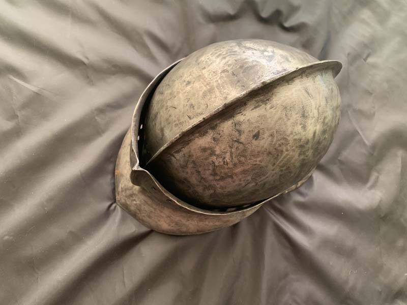 Данный шлем имеет неровности и слегка рельефную поверхность на которой видны следы ковки. Также на металлических частях есть следы кривизны.