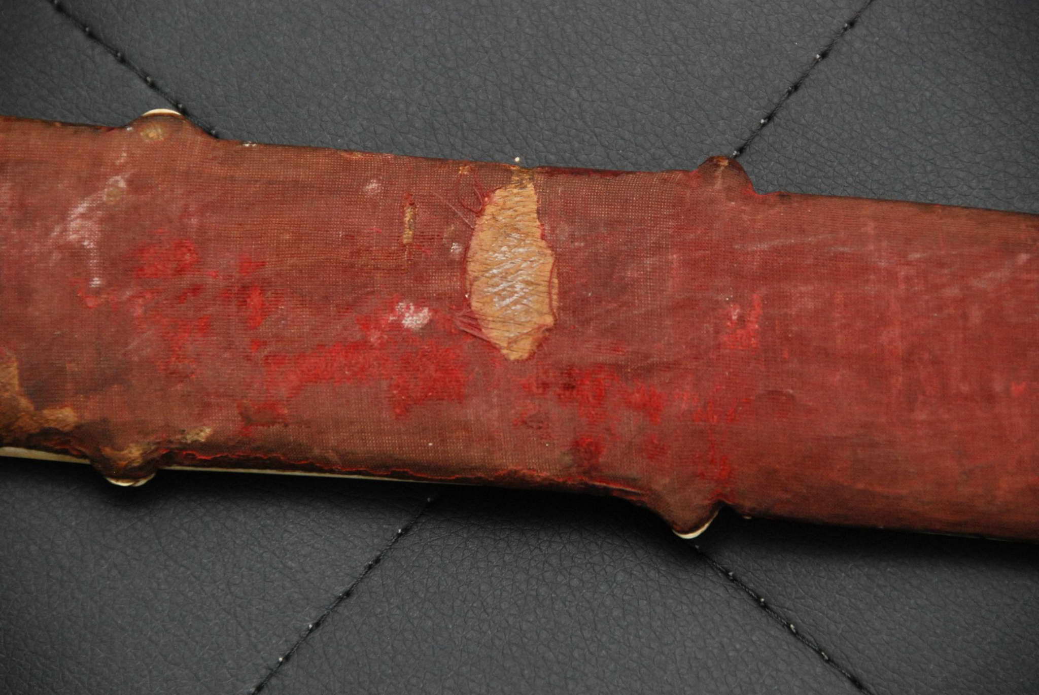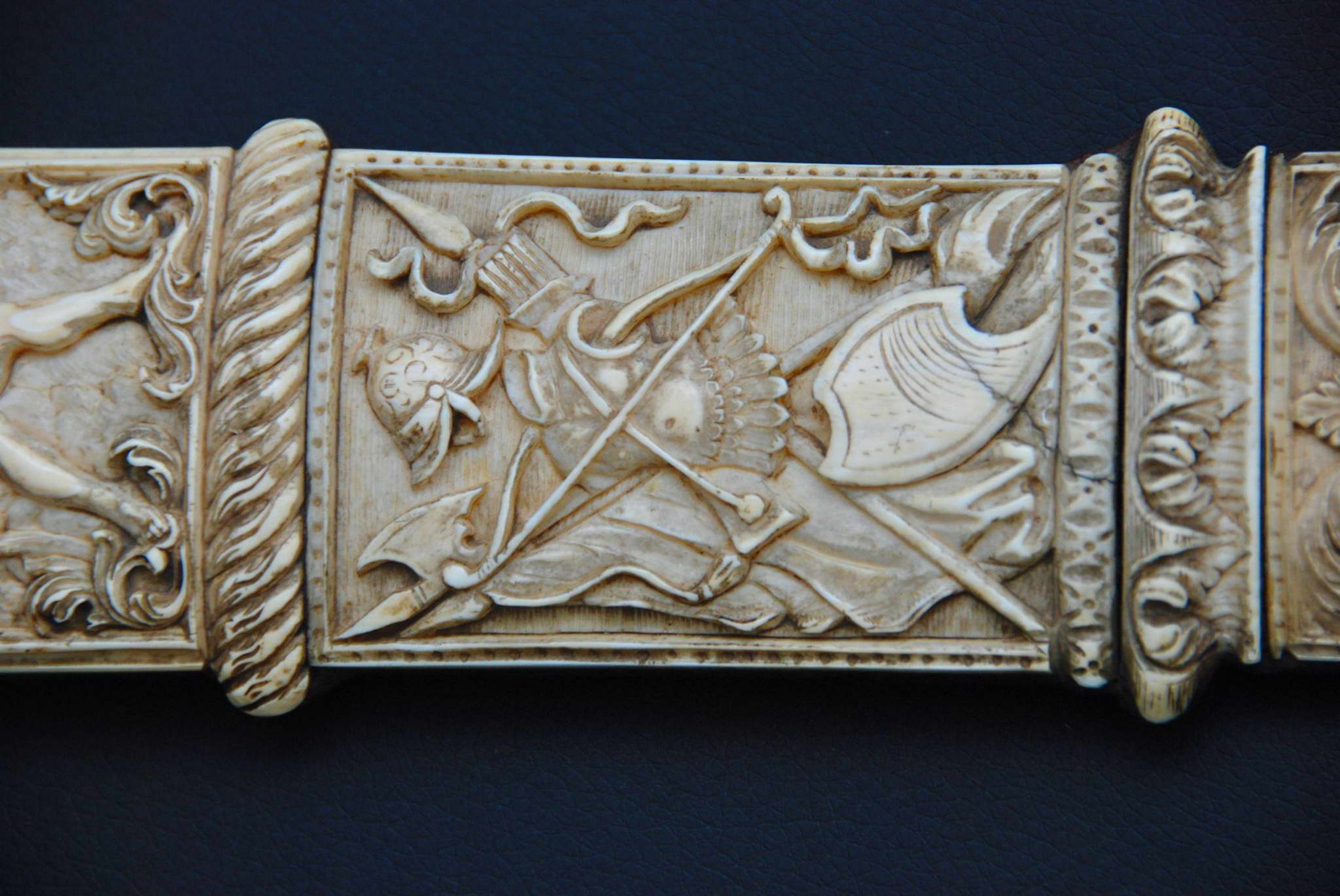 Ножны и рукоять украшены тонкой глубокой резьбой по слоновой кости, изображающей сцены из греческой мифологии, трофеи и цветочный орнамент, с обратной стороны ножны и рукоятка покрыты бархатом, который практически стерся.