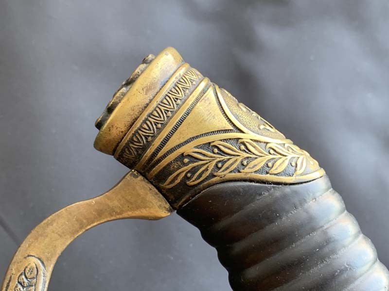 Внизу на рукояти латунная втулка. Гарда образована одной передней дужкой, исходящей от навершия и, плавно изгибаясь, переходящей в узкую крестовину, конец которой загнут в сторону клинка и имеет круглое сквозное отверстие для крепления темляка. В центральной части с обеих сторон передняя дужка декорирована высокорельефными литыми изображениями широкого пояска и лавровых ветвей в линейной окантовке, исходящих от него в обе стороны (вверх и вниз). Конец крестовины имеет отверстие, слегка загнут вниз и закруглен.