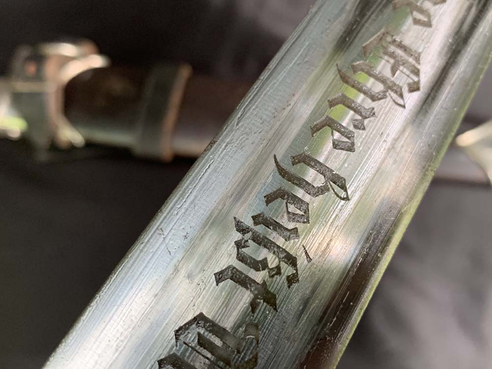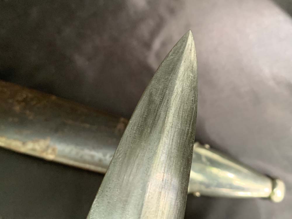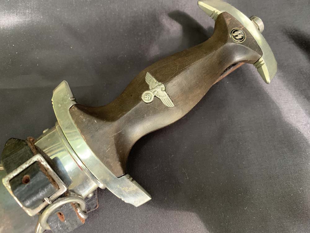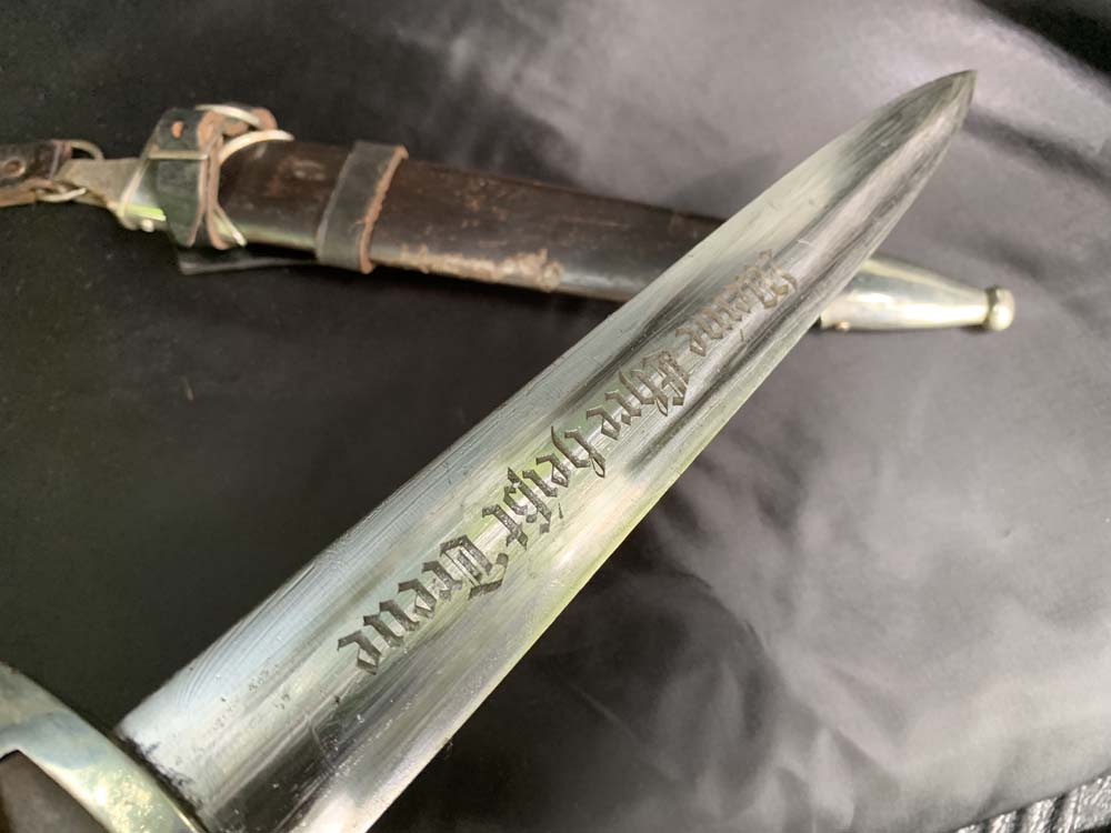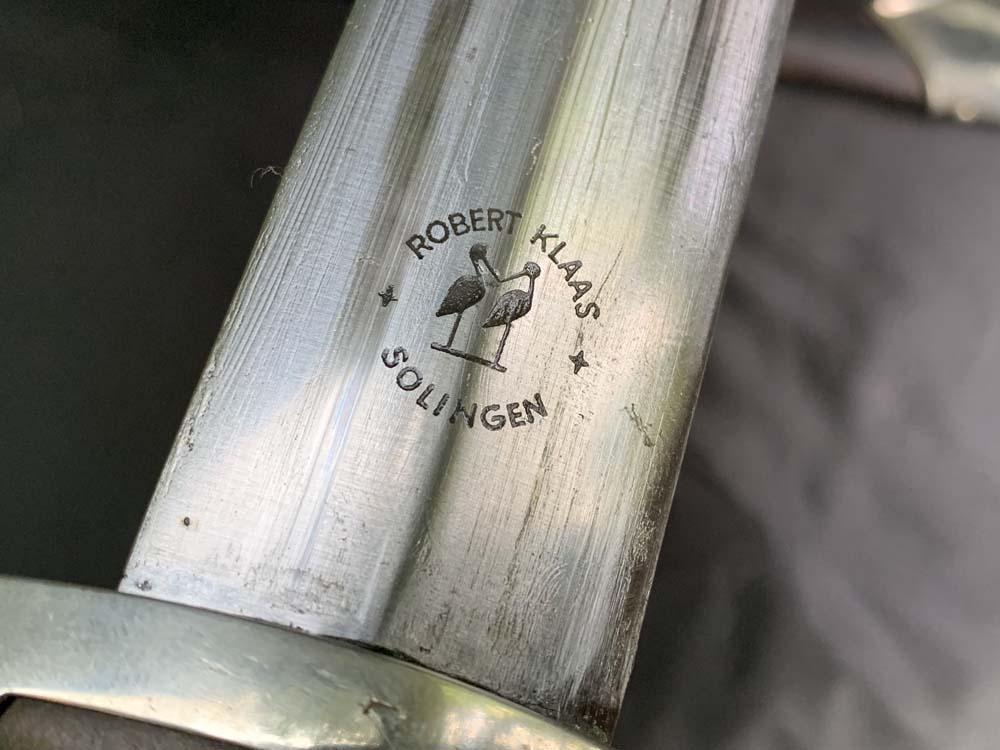 Клинок: Клинок кинжала прямой, стальной, двулезвийный, кинжального типа, с выраженным центральным ребром. На одной стороне клинка методом травления нанесен девиз СС «Meine Ehre heisst Treue» (Моя честь называется верностью). У основания клинка клеймо производителя Robert Klaas Solingen.