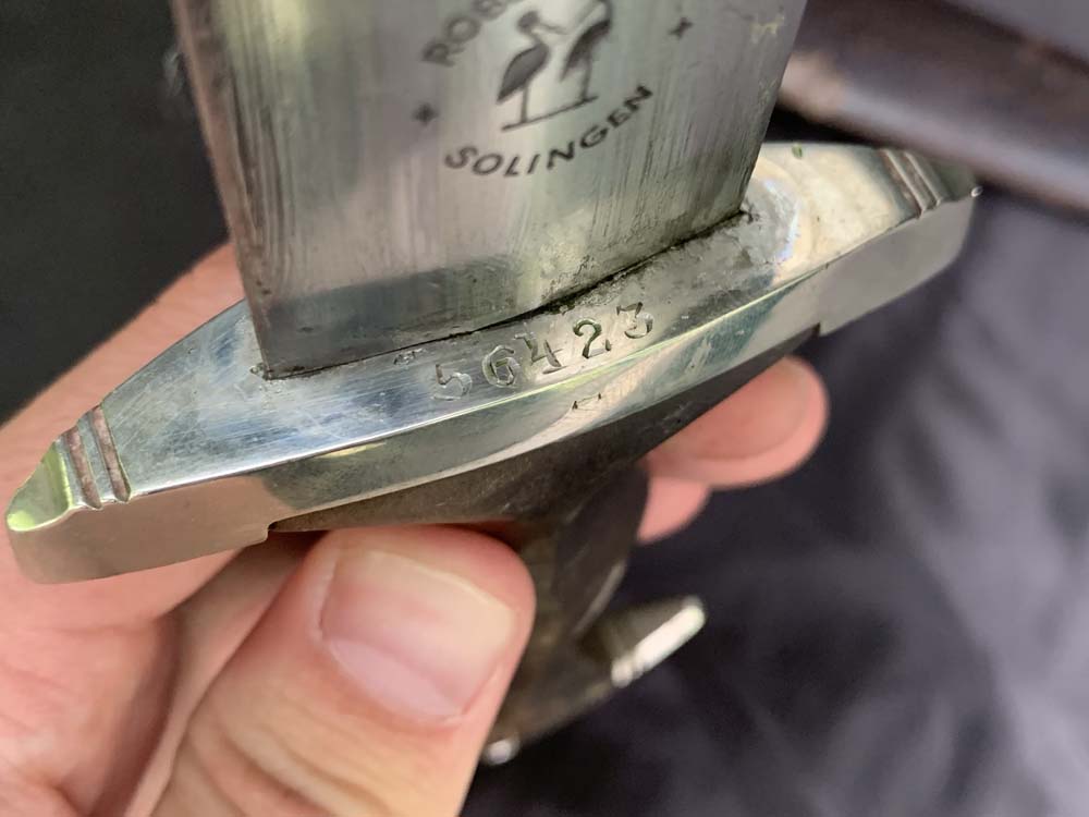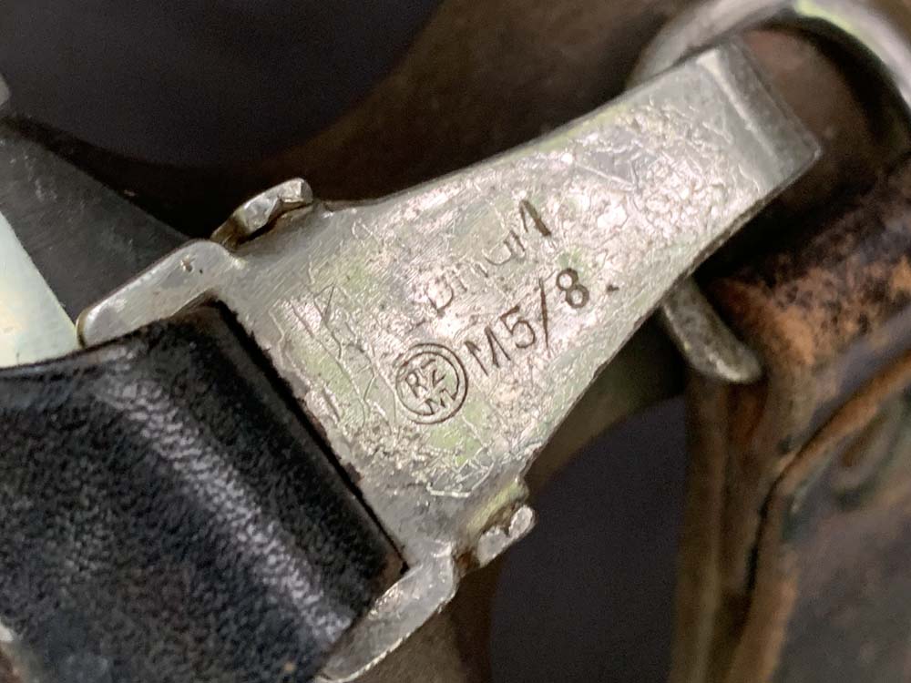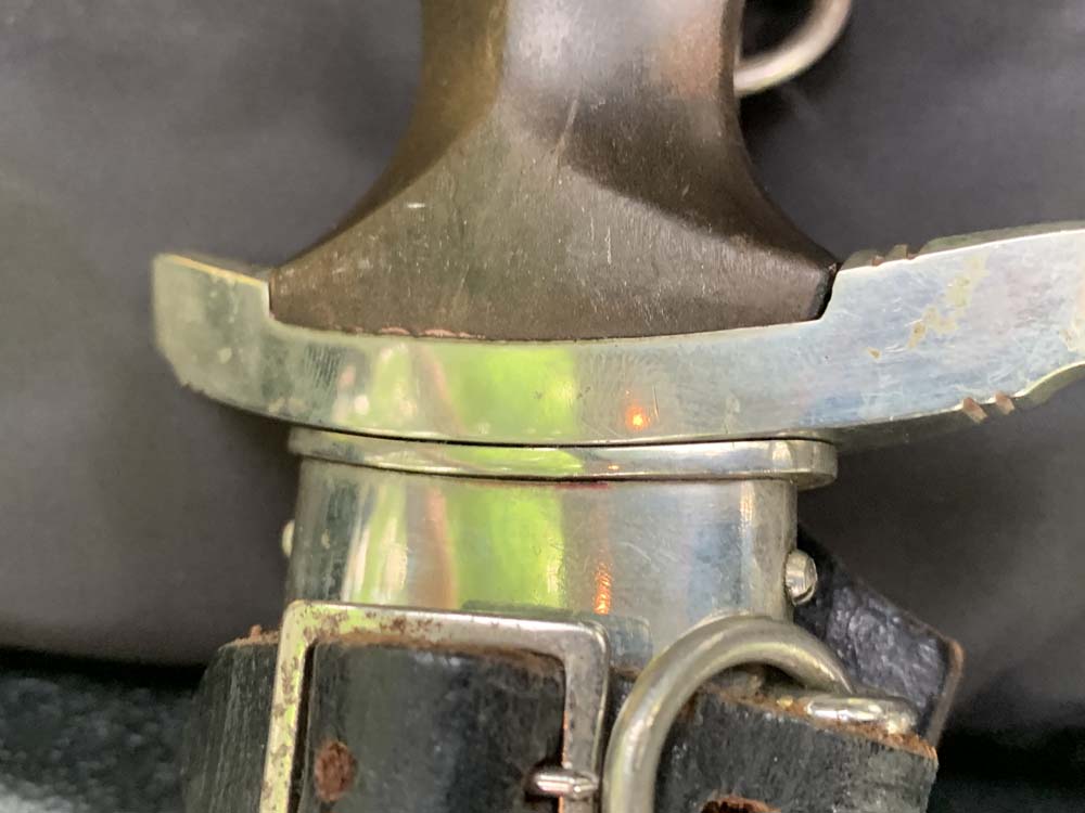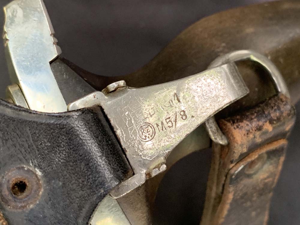Ножны: Ножны металлические, анодированные. Прибор ножен изготовлен из белого металла и состоит из устья с гайкой и кольцом для подвешивания на ремень и устья с шариком. Этот кинжал СС имеет вертикальный подвес с клеймом RZM 5/8.