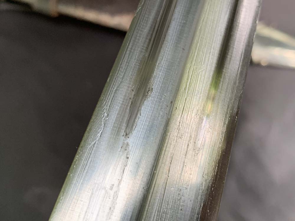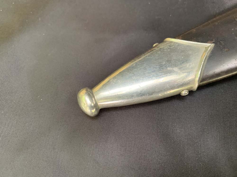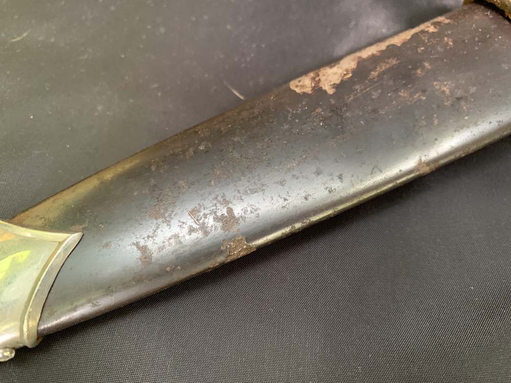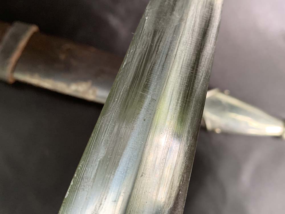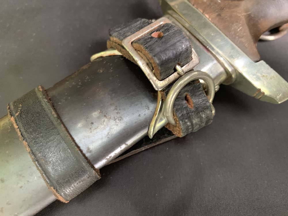 Ножны: Ножны металлические, анодированные. Прибор ножен изготовлен из белого металла и состоит из устья с гайкой и кольцом для подвешивания на ремень и устья с шариком. Этот кинжал СС имеет вертикальный подвес с клеймом RZM 5/8.
