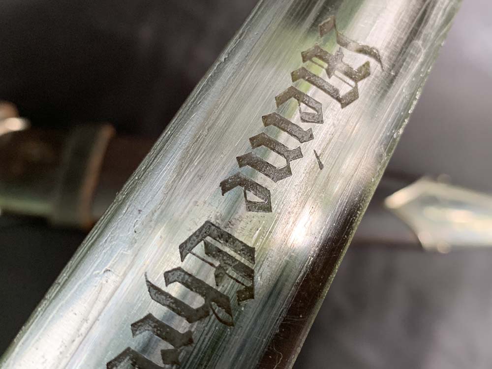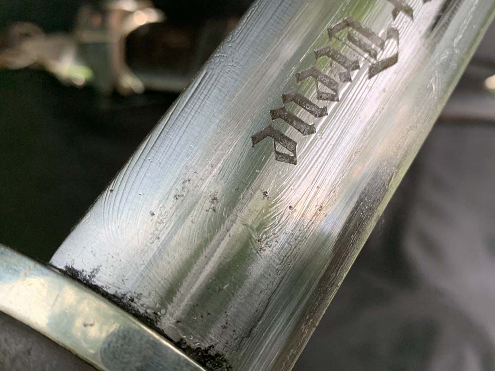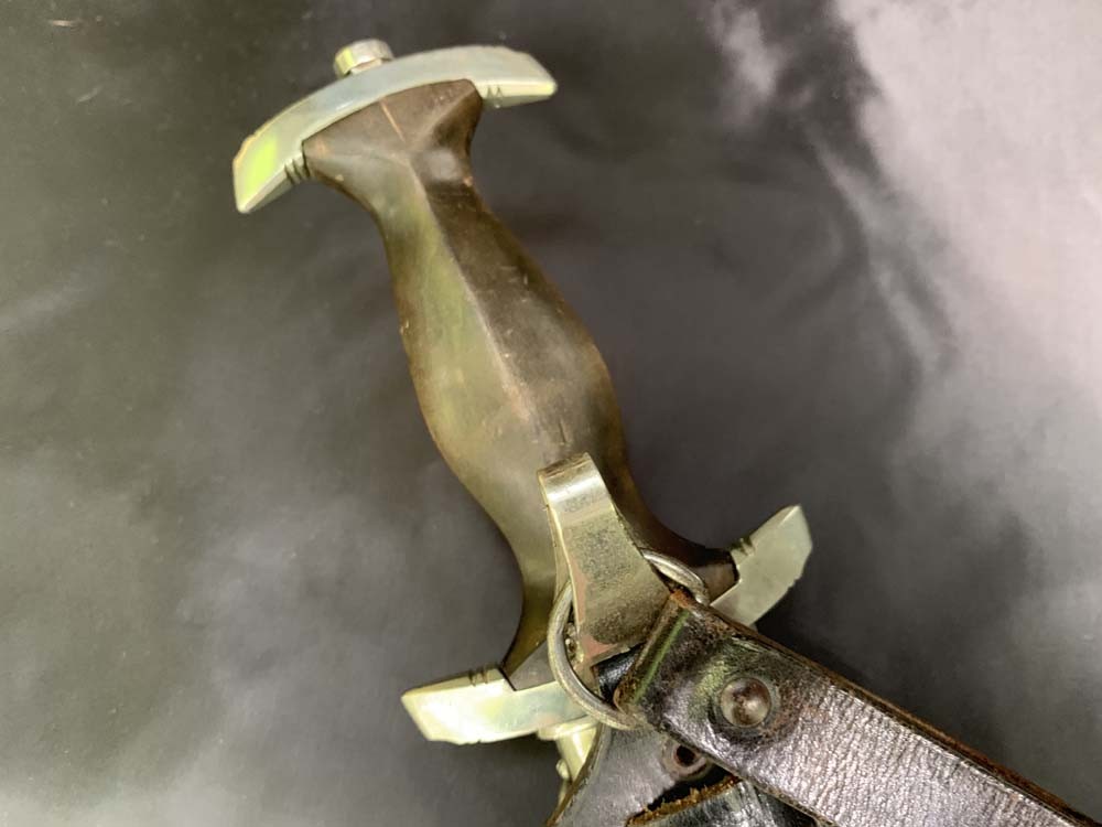 Рукоять: Рукоять из мореного в черный цвет дерева. Рукоять в верхней части имеет вставку в виде черного эмалевого глазка с рунами, в средней части рукояти – металлический знак в виде стилизованного изображения раскинувшего крылья орла, держащего в когтях венок со свастикой. Металлические элементы гарды изготовлены из мельхиора. Крестовина С-образная, белого металла, с концами, чуть загнутыми вверх, в несколько увеличенном и перевернутом виде копирует навершие рукояти- «I» [Мюнхен]. С внутренней части крестовины штампом нанесен номер: «56423».