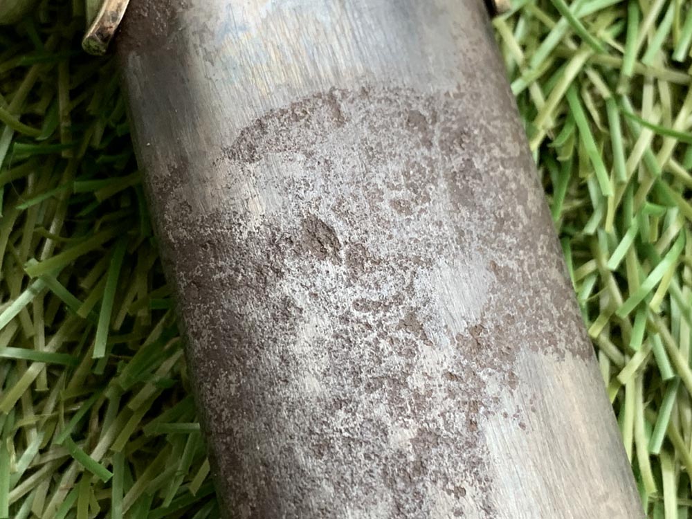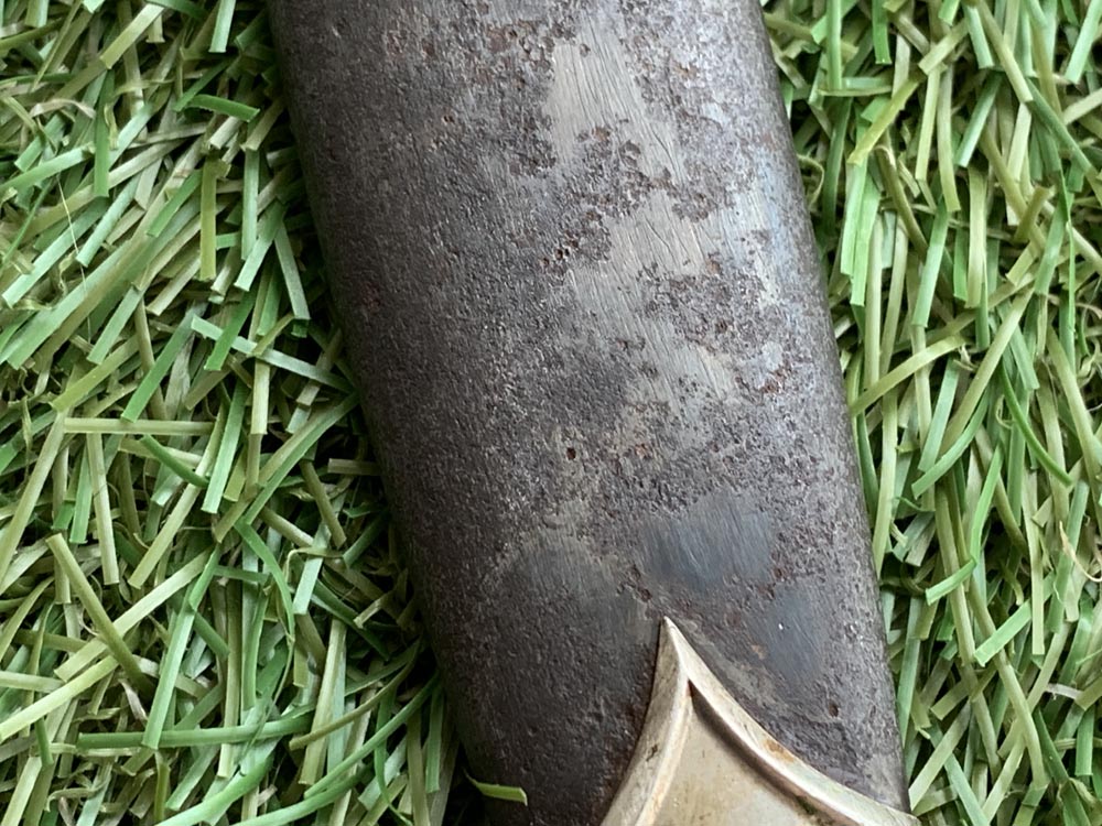 Ножны: Ножны металлические, анодированные. Прибор ножен изготовлен из белого металла и состоит из устья с гайкой и кольцом для подвешивания на ремень и устья с шариком.