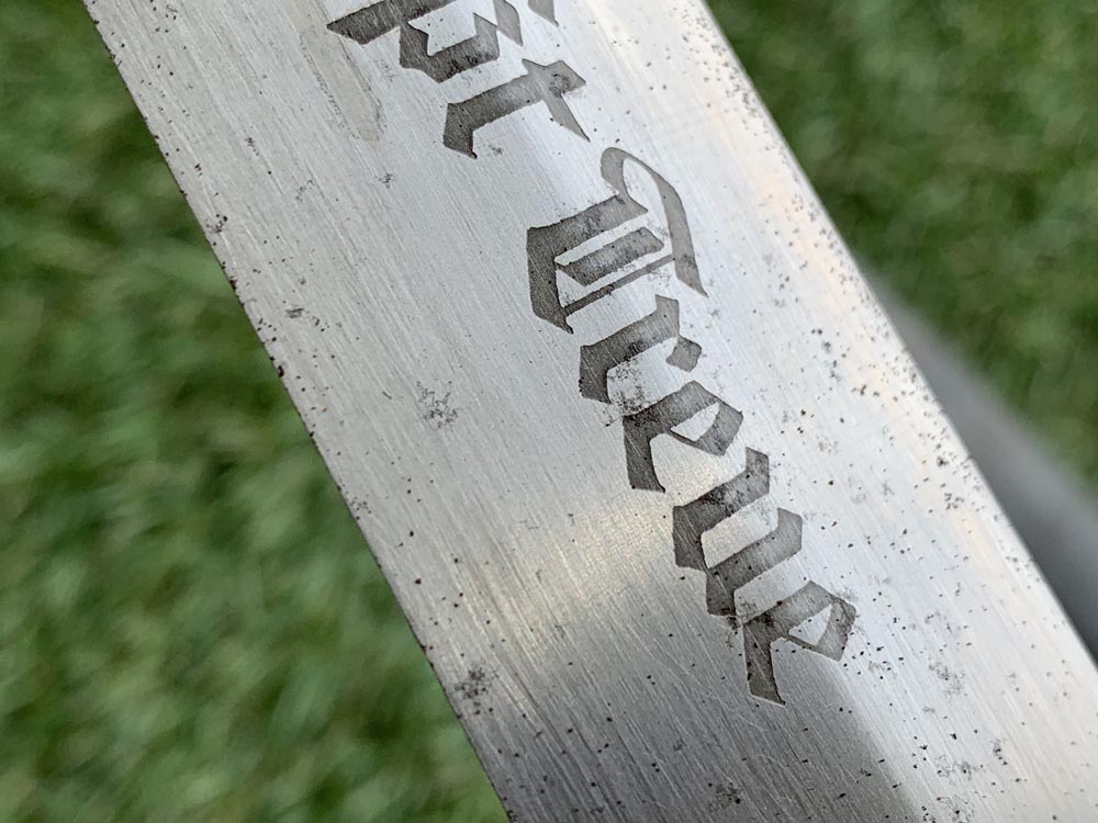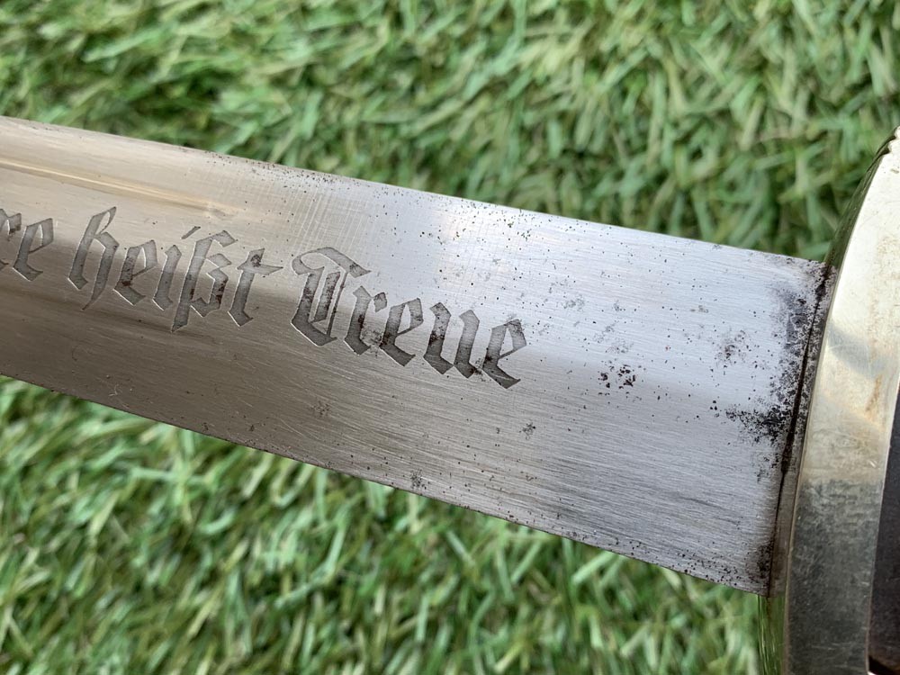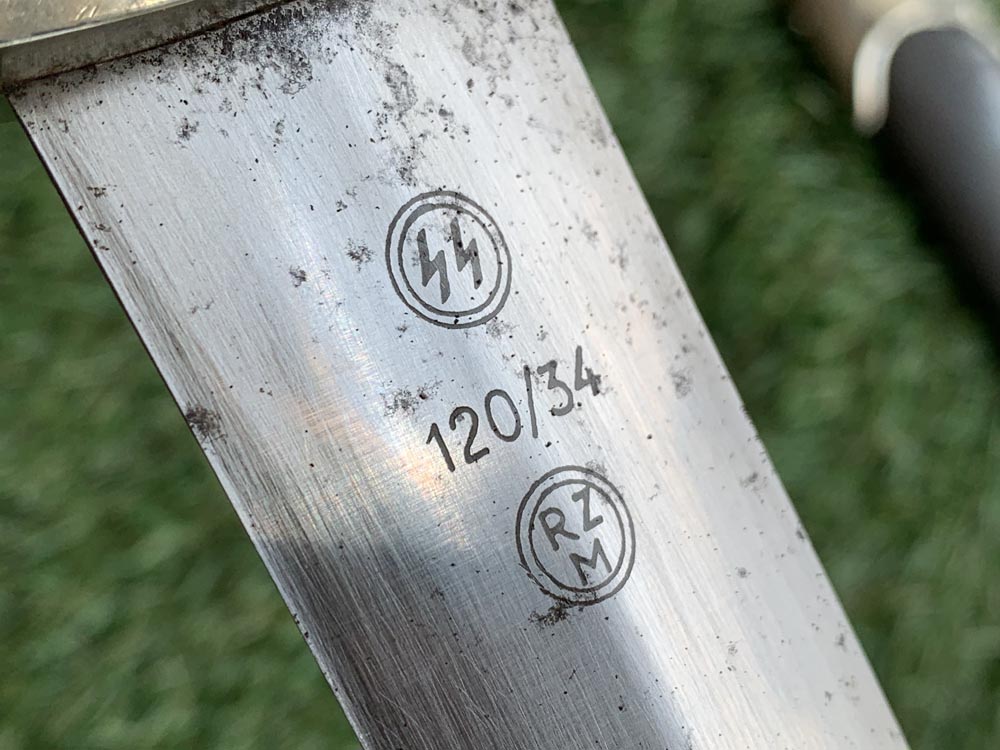 Клинок: Клинок кинжала прямой, стальной, двулезвийный, кинжального типа, с выраженным центральным ребром. На одной стороне клинка методом травления нанесен девиз СС «Meine Ehre heisst Treue» (Моя честь называется верностью). Клинок на оборотной стороне у основания стоит RZM клеймо SS 120/34 RZM.