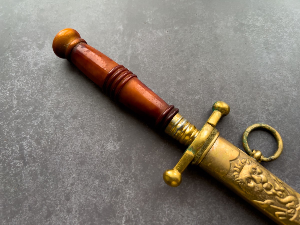 «Предлагаем вашему вниманию редкий кортик, являющийся сочетанием истории и мастерства — датский морской офицерский кортик образца 1851 года, изготовленный в начале XX века немецкой компанией «E.& F. Horster, Solingen». ?️ Этот кортик, украшенный клеймом дистрибьютора «Magasin du Nord» из Копенгагена, является не только прекрасным образцом военного оружия, но и настоящим коллекционным артефактом. Сохранив свой первоначальный вид и элегантность, он станет прекрасным дополнением к любой коллекции антикварного оружия или исторических экспонатов. Идеален для поклонников морской истории и коллекционеров!»