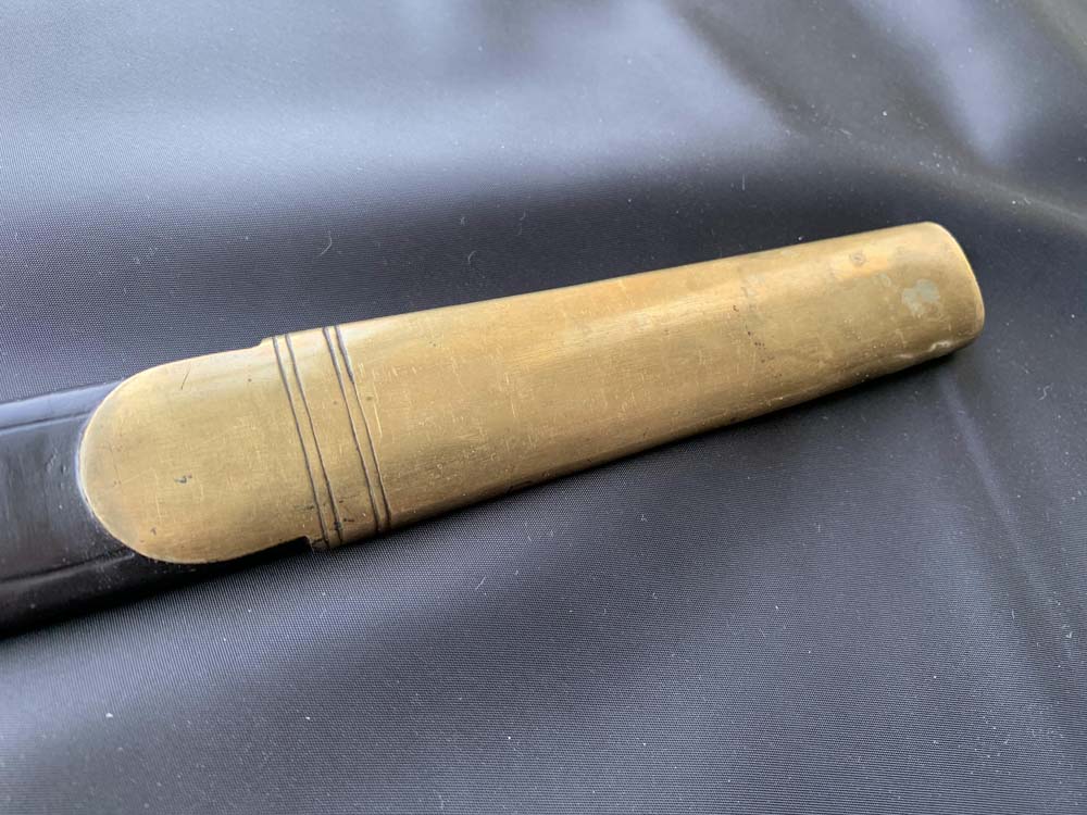 Ножны деревянные, покрытые кожей, с латунным прибором, состоящим из устья и наконечника. На устье ножен находиться кармашек для маленького ножа (пасынка).