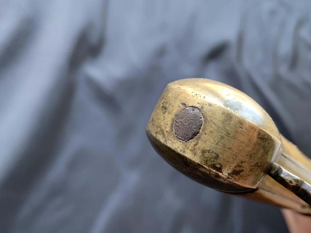 Эфес меча состоит из латунных деталей. Рукоять изготовлена из костяных накладок, состоит из четырех частей. Навершие рукояти латунное, закругленное и на торце имеет заклеп. Дужка рукояти латунная, соединена с крестовиной. Крестовина прямая, концы шестигранные. На внешней стороне рукояти в кости есть декоративная ажурная вставка также из латуни.