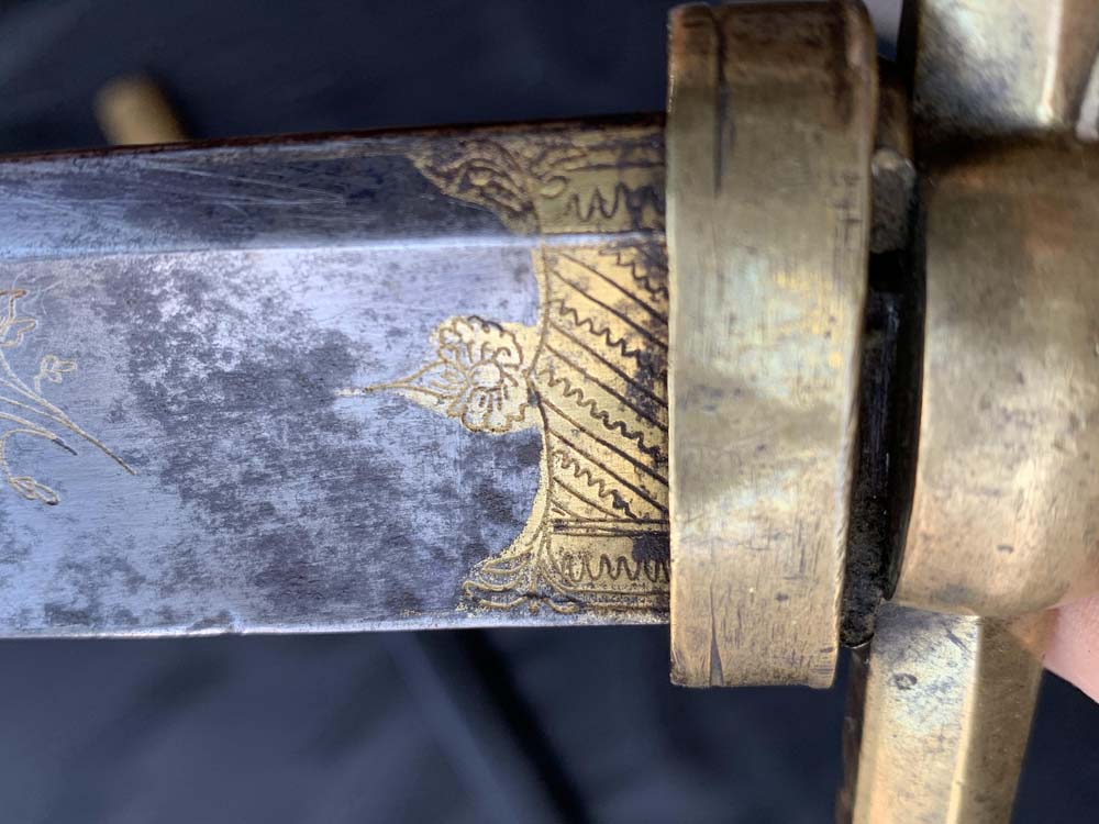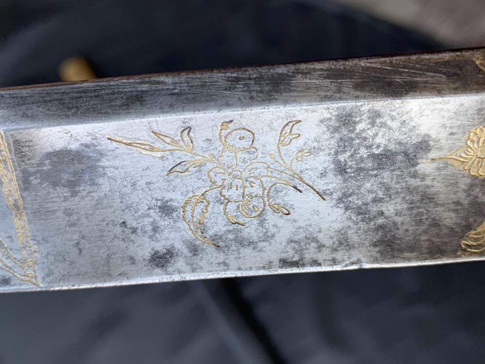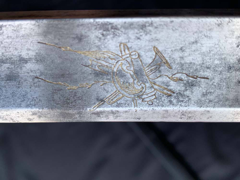Клинок меча прямой, с широким обухом с одной стороны и одним широким долом. Боевой конец двулезвийный, линзовидного сечения. Клинок украшен рисунками на охотничью и растительную тематику с обеих сторон, а также элементами золочения и (остатками) синения.