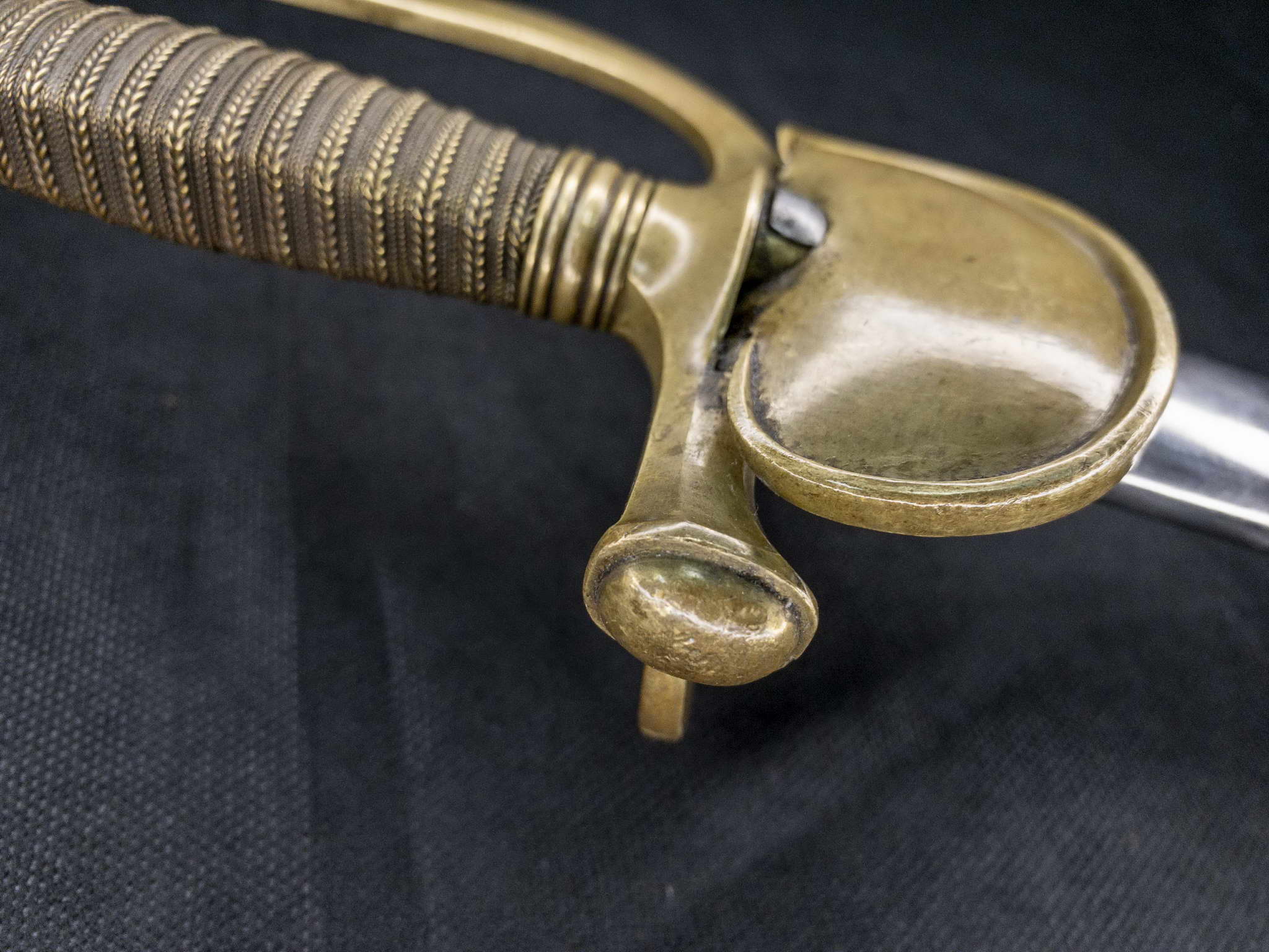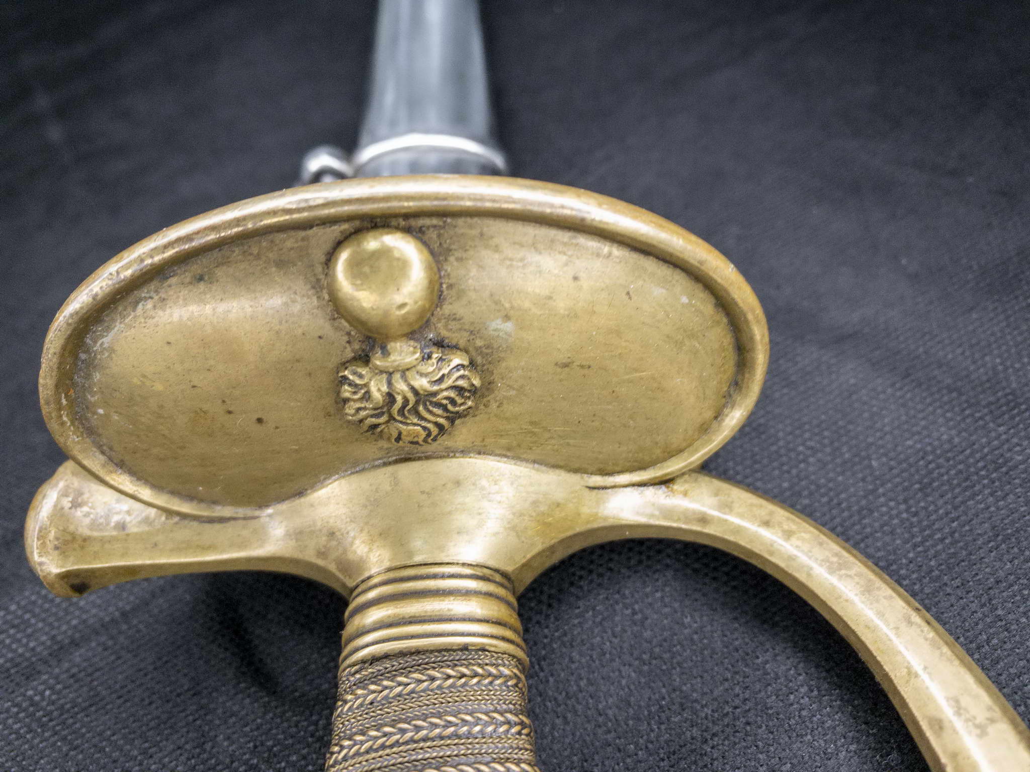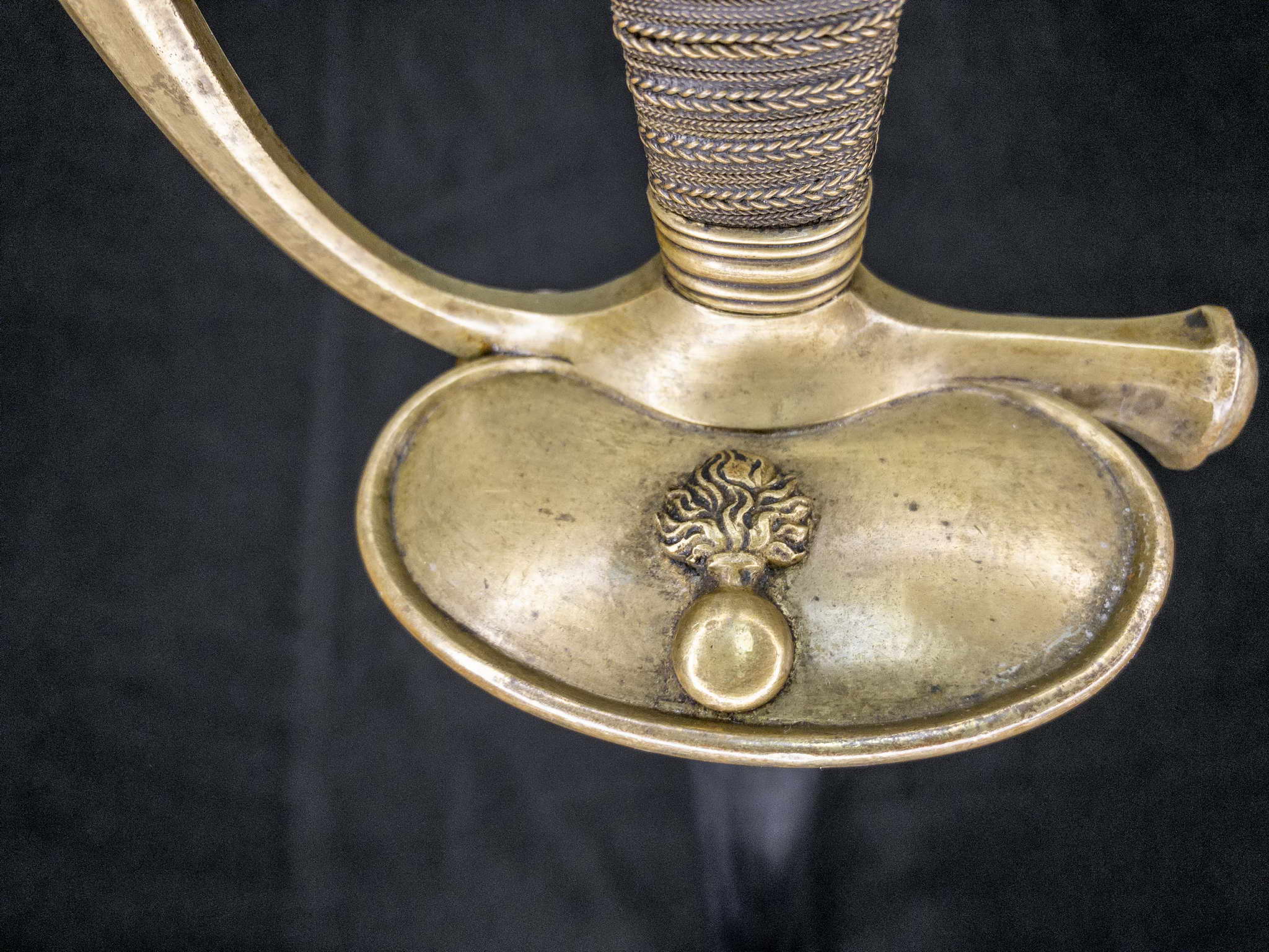 Латунный эфес с головкой в виде оливки. Соединительная дужка гладкая с вбитыми инспекторскими клеймами «R,D,S,1» и номером «4683», крестовина оканчивается раструбом. Рукоять обмотана двойной филигранью из проволоки. Чашка гарды с латунным изображением воспламененной гранаты.