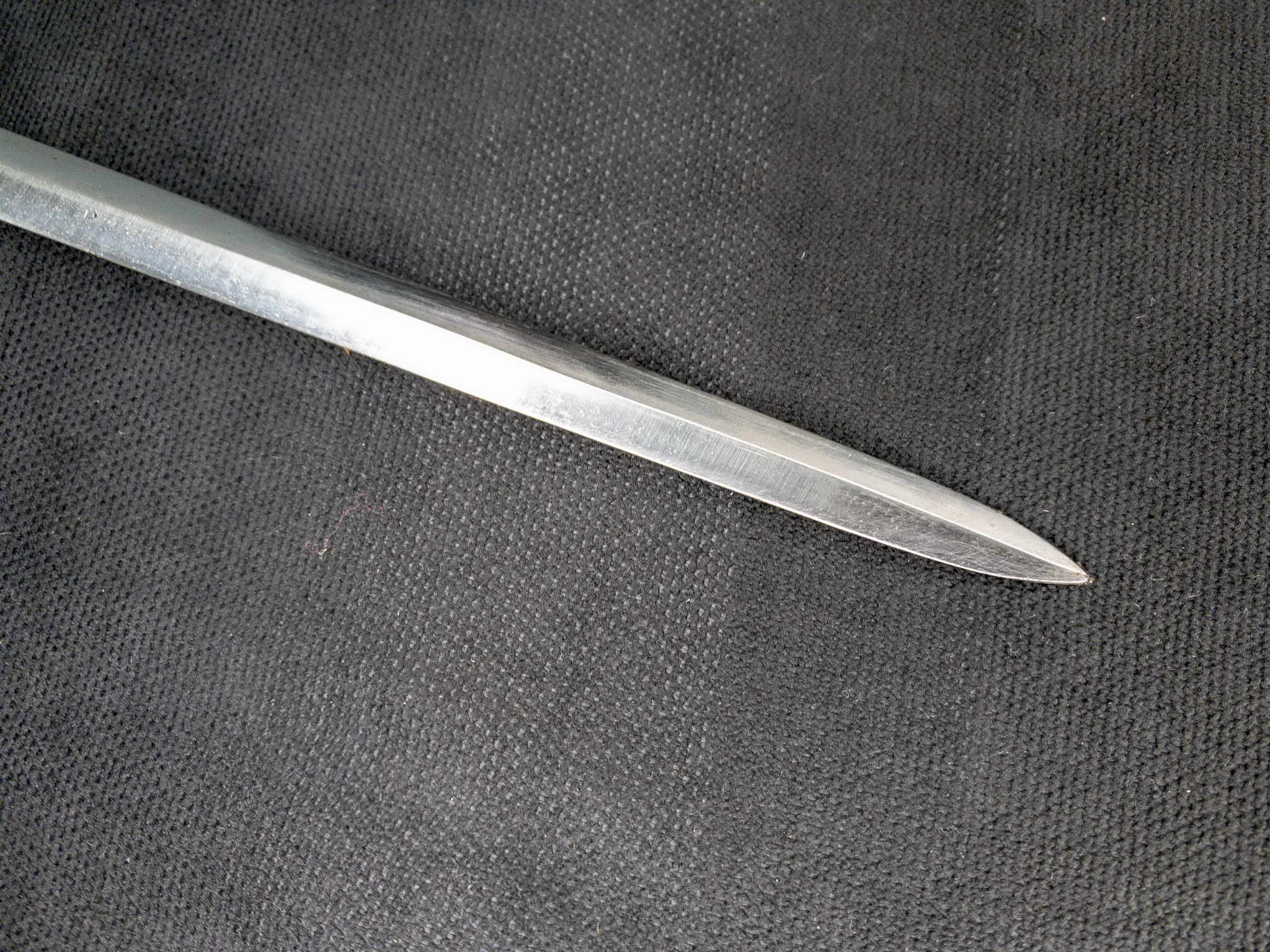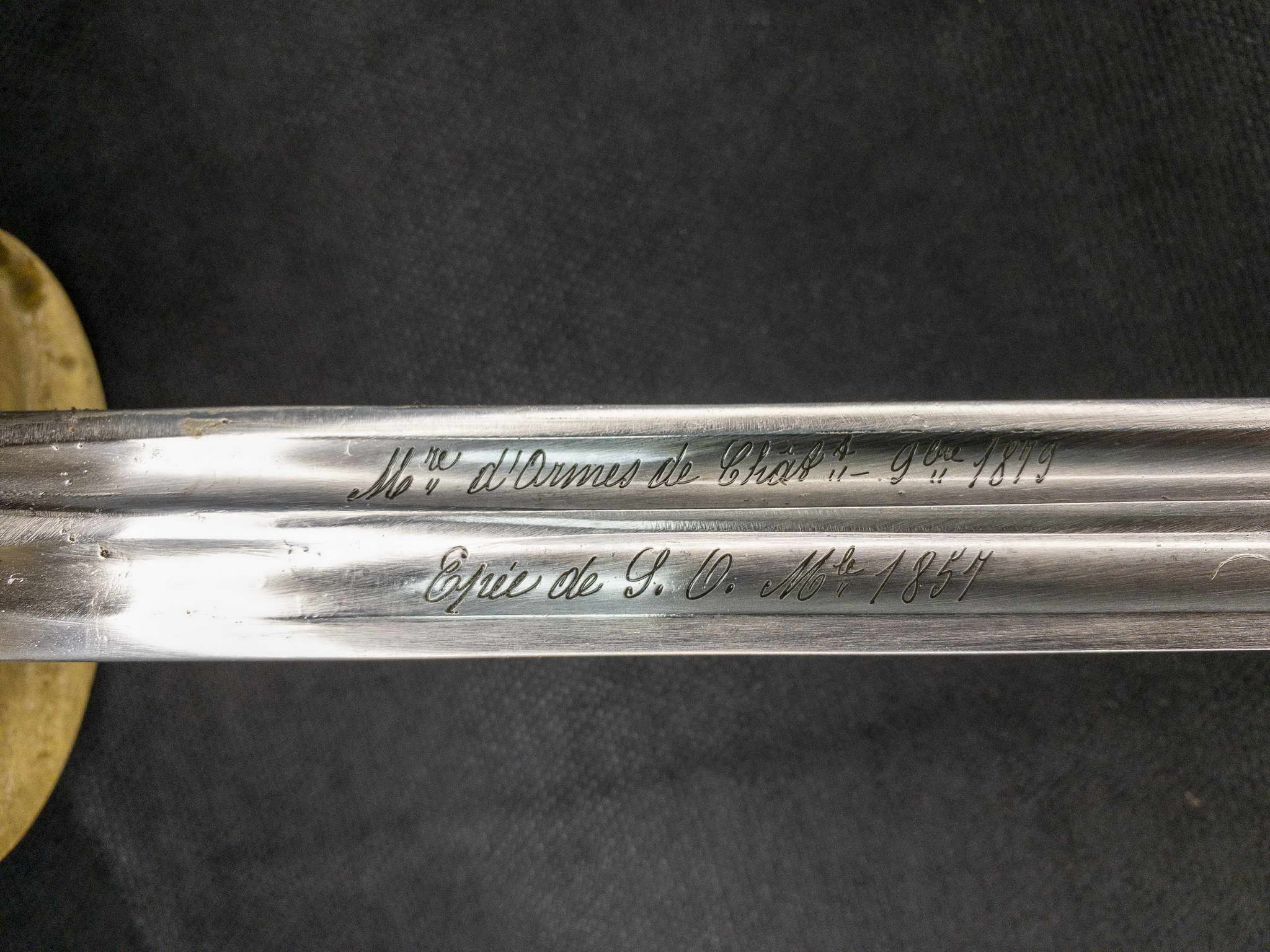 Клинок шпаги стальной, кованый, ромбического сечения, плавно сужающийся к кончику клинка. На клинке присутствую два дола по обе стороны клинка. На пяте клинка визуально наблюдается штамбы по обе стороны в виде букв «В», так называемые инспекторские клейма. На клинке также присутствует надпись на французском Mre D’ARMES DE CHATLI fev 1879. Epée de J.O. mie 1857 (Оружейный мастер из Шатли. май 1879 г. Шпага унтер-офицера, модель 1857 г.).
