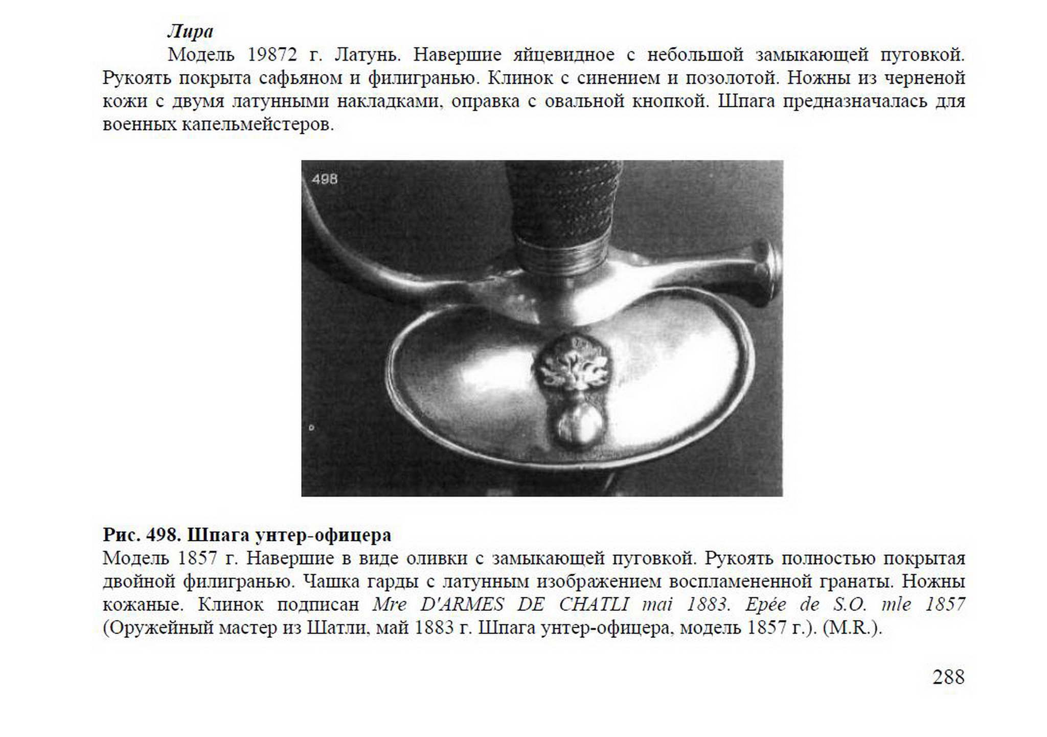 Модель 1857 г. Навершие в виде оливки с замыкающей пуговкой. Рукоять полностью покрытая двойной филигранью. Чашка гарды с латунным изображением воспламененной гранаты. Ножны кожаные. Клинок подписан Mre D’ARMES DE CHATLI mai 1883. Epée de S.O. mie 1857 (Оружейный мастер из Шатли. май 1883 г. Шпага унтер-офицера, модель 1857 г.). (M.R.).